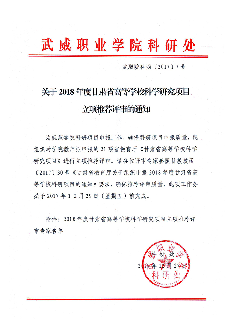 關(guān)于2018年度甘肅省高等學(xué)??茖W(xué)研究項目立項推薦評審的通知