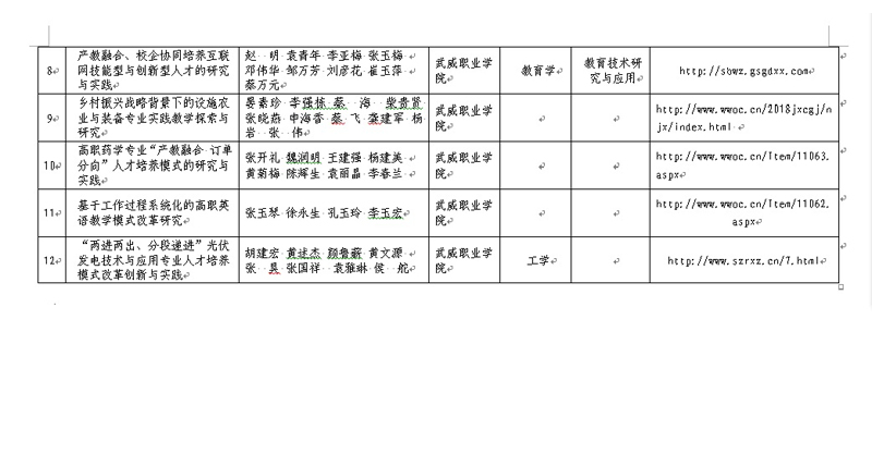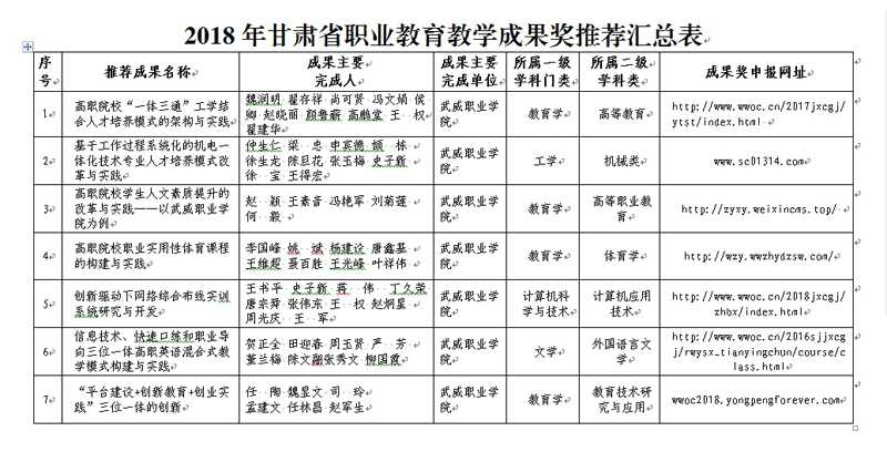 根據(jù)甘肅省人力資源和社會保障廳、甘肅省教育廳《關(guān)于開展2018年甘肅省職業(yè)教育教學成果獎評選表彰工作的通知》精神,經(jīng)個人申報,學院審核,決定擬推薦以下所提交紙質(zhì)材料、電子材料、申報網(wǎng)站等符合申報要求的12項教學成果參評2018年甘肅省職業(yè)教育教學成果獎,現(xiàn)予以公示。