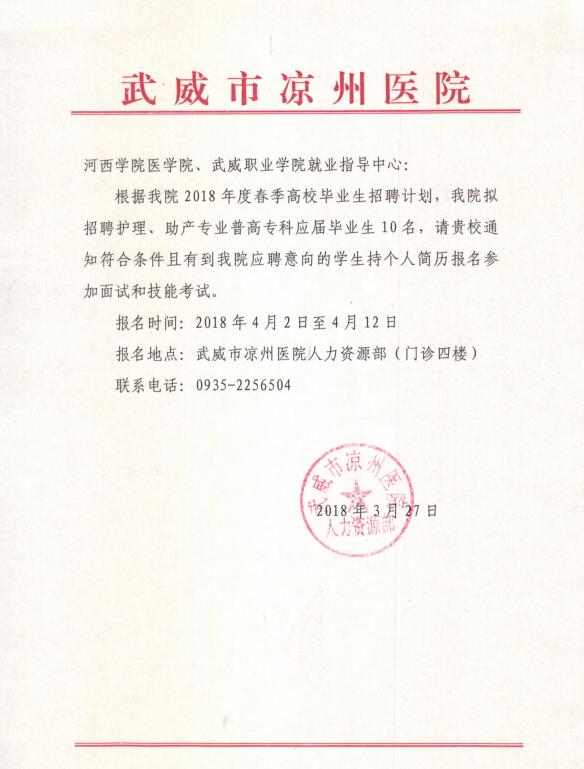 ? ? ? ?武威市涼州醫(yī)院擬招聘護(hù)理、助產(chǎn)專業(yè)畢業(yè)生10名,報(bào)名時(shí)間2018年4月2日~4月12日,報(bào)名時(shí)請攜帶個(gè)人簡歷,一寸彩色照片一張,請我系15級應(yīng)屆畢業(yè)生積極響應(yīng),踴躍報(bào)名!