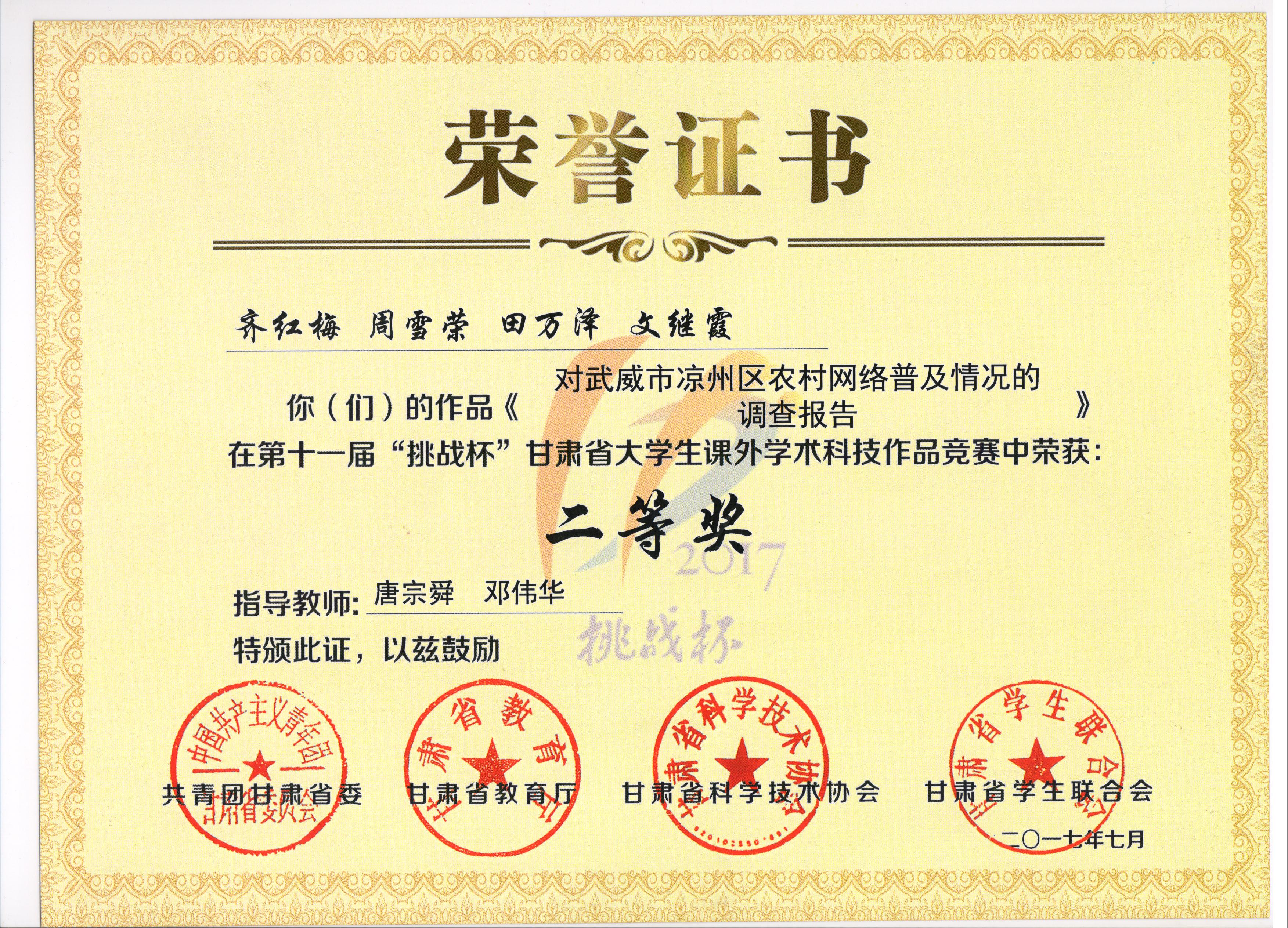 決賽期間,副院長田迎春作為嘉賓出席了終審決賽開幕式,并親臨展演現(xiàn)場指導,鼓勵同學們?nèi)〉煤贸煽?。在公開展示、現(xiàn)場路演、終審答辯等環(huán)節(jié),我院代表隊表現(xiàn)出色,給評審專家和前來觀摩的各高校師生留下了深刻的印象。最終經(jīng)過評審委員會終審評審,電子信息工程系選送的《對武威市涼州區(qū)農(nóng)村網(wǎng)絡(luò)普及情況的調(diào)查報告》作品榮獲二等獎?! ?/p>