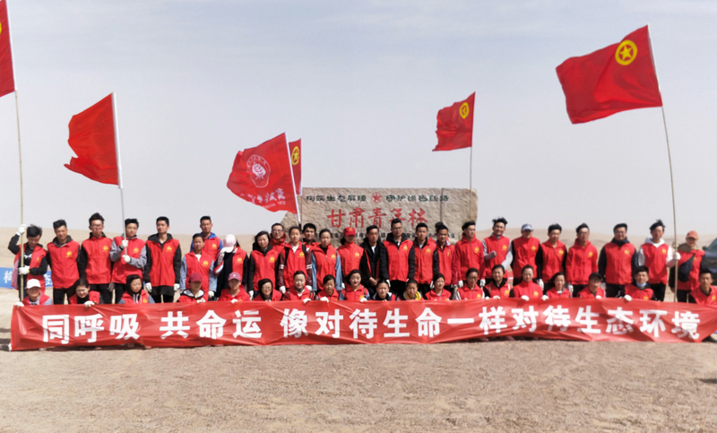 為傳播綠色發(fā)展理念,引導(dǎo)青年學(xué)生牢固樹立“綠水青山就是金山銀山”的理念,積極投身植樹造林、美化環(huán)境、治沙壓沙等生態(tài)文明建設(shè)的生動實踐,4月14日,團省委在民勤縣昌寧鎮(zhèn)四方墩志愿者生態(tài)林基地舉辦 “構(gòu)筑生態(tài)屏障·助力脫貧攻堅”暨2018年“甘肅青年林”春季植樹活動啟動儀式。學(xué)院團委組織53名志愿者參加活動啟動儀式和義務(wù)植樹壓沙活動。