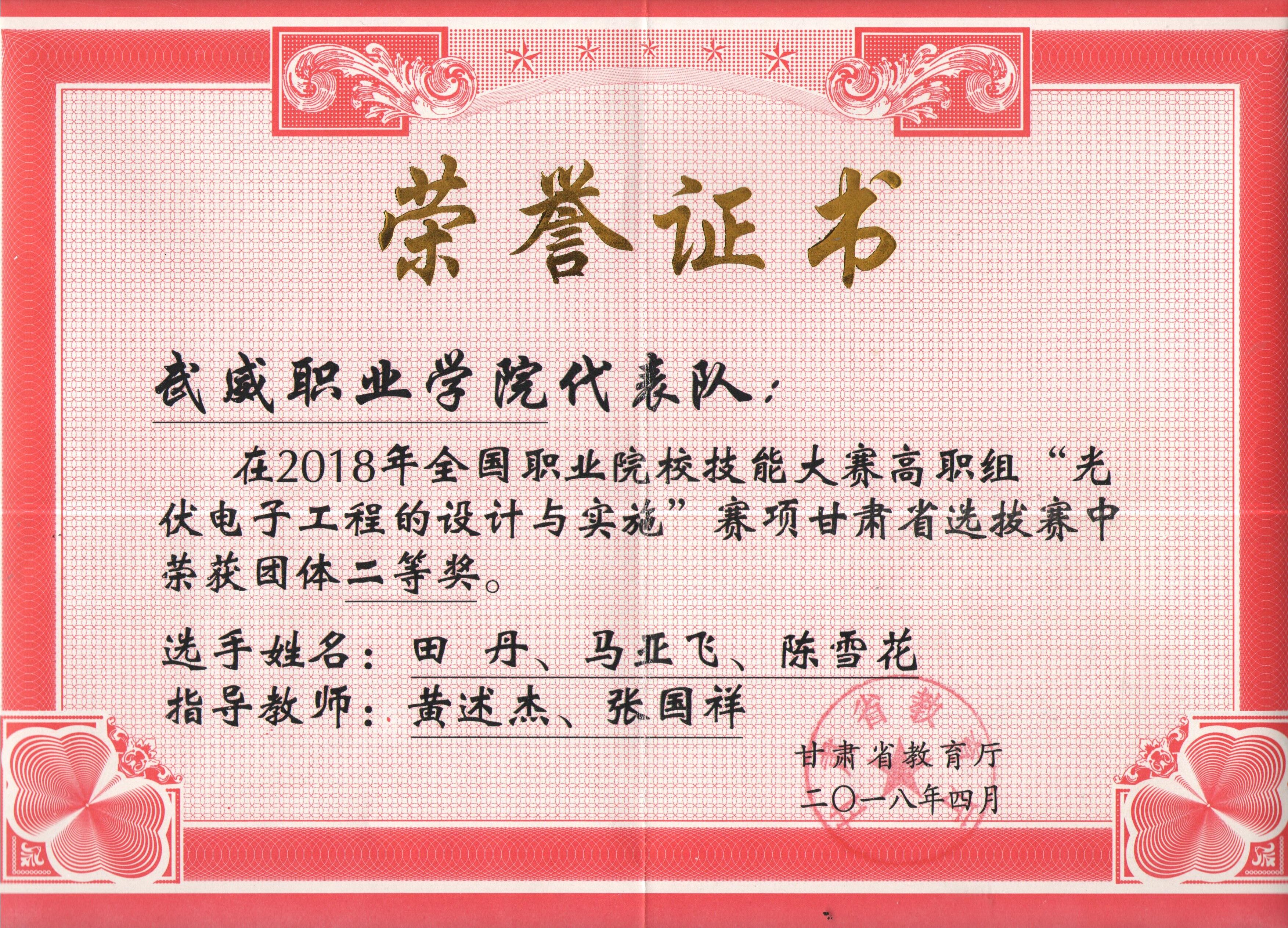 4月14日,2018年全國職業(yè)院校技能大賽“光伏電子工程的設(shè)計(jì)與實(shí)施”賽項(xiàng)甘肅省選拔賽在甘肅林業(yè)職業(yè)技術(shù)學(xué)院舉行。此次大賽有蘭州石化職業(yè)技術(shù)學(xué)院、甘肅林業(yè)職業(yè)技術(shù)學(xué)院、武威職業(yè)學(xué)院等6所院校的11支代表隊(duì)33名選手參加。由我院能源工程系黃述杰、張國祥老師指導(dǎo),田丹、馬亞飛、陳雪花三名學(xué)生組成的武威職業(yè)學(xué)院一隊(duì)榮獲二等獎。