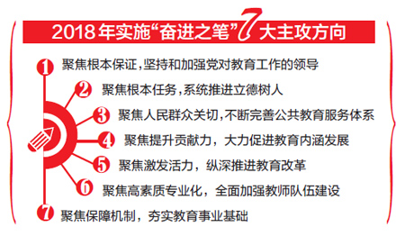 陳寶生指出,黨的十九大對教育工作作出了全面系統(tǒng)部署。在加快教育現(xiàn)代化、建設(shè)教育強國的新征程中,解決教育發(fā)展不平衡不充分的問題將是我們長期要面對的工作主題。要以問題為導(dǎo)向,將其作為實施“奮進之筆”的著力點和主攻方向。一是聚焦根本保證,堅持和加強黨對教育工作的領(lǐng)導(dǎo)。要把黨的政治建設(shè)擺在首位,狠抓大抓基層黨組織建設(shè),持之以恒正風(fēng)肅紀(jì),抓好意識形態(tài)工作。二是聚焦根本任務(wù),系統(tǒng)推進立德樹人。要把德育擺在更加重要的位置,堅定青少年理想信念,改進和加強思想政治工作,大力發(fā)展素質(zhì)教育,加強語言文字工作。三是聚焦人民群眾關(guān)切,不斷完善公共教育服務(wù)體系。要促進學(xué)前教育普惠健康發(fā)展,加快城鄉(xiāng)義務(wù)教育一體化發(fā)展步伐,加大普及高中階段教育攻堅力度,加大對困難地區(qū)扶持力度,切實加強校園安全。四是聚焦提升貢獻力,大力促進教育內(nèi)涵發(fā)展。要以質(zhì)量為本,持續(xù)推進職業(yè)教育質(zhì)量提升,健全高等教育內(nèi)涵發(fā)展政策機制,辦好繼續(xù)教育。五是聚焦激發(fā)活力,縱深推進教育改革。要深化“放管服”改革,實施考招改革“拓展深化”攻堅行動,支持和規(guī)范社會力量興辦教育,堅定不移以開放促改革。六是聚焦高素質(zhì)專業(yè)化,全面加強教師隊伍建設(shè)。實施教師隊伍“建設(shè)改革”攻堅行動,健全師德師風(fēng)建設(shè)長效機制,完善教師管理制度,提升教師獲得感、幸福感和榮譽感。七是聚焦保障機制,夯實教育事業(yè)基礎(chǔ)。要落實教育投入責(zé)任,加快教育信息化步伐,全力推進依法治教。
