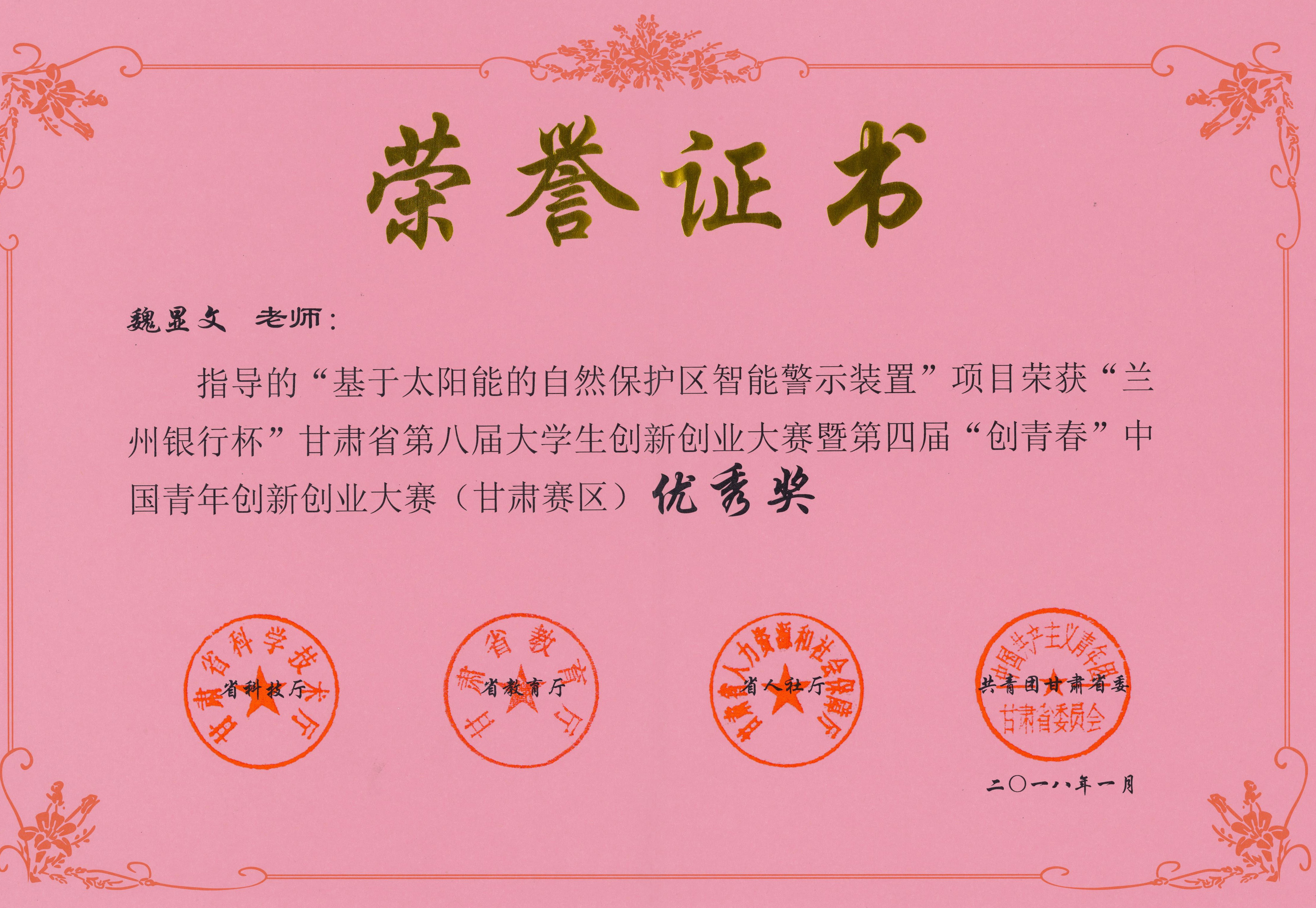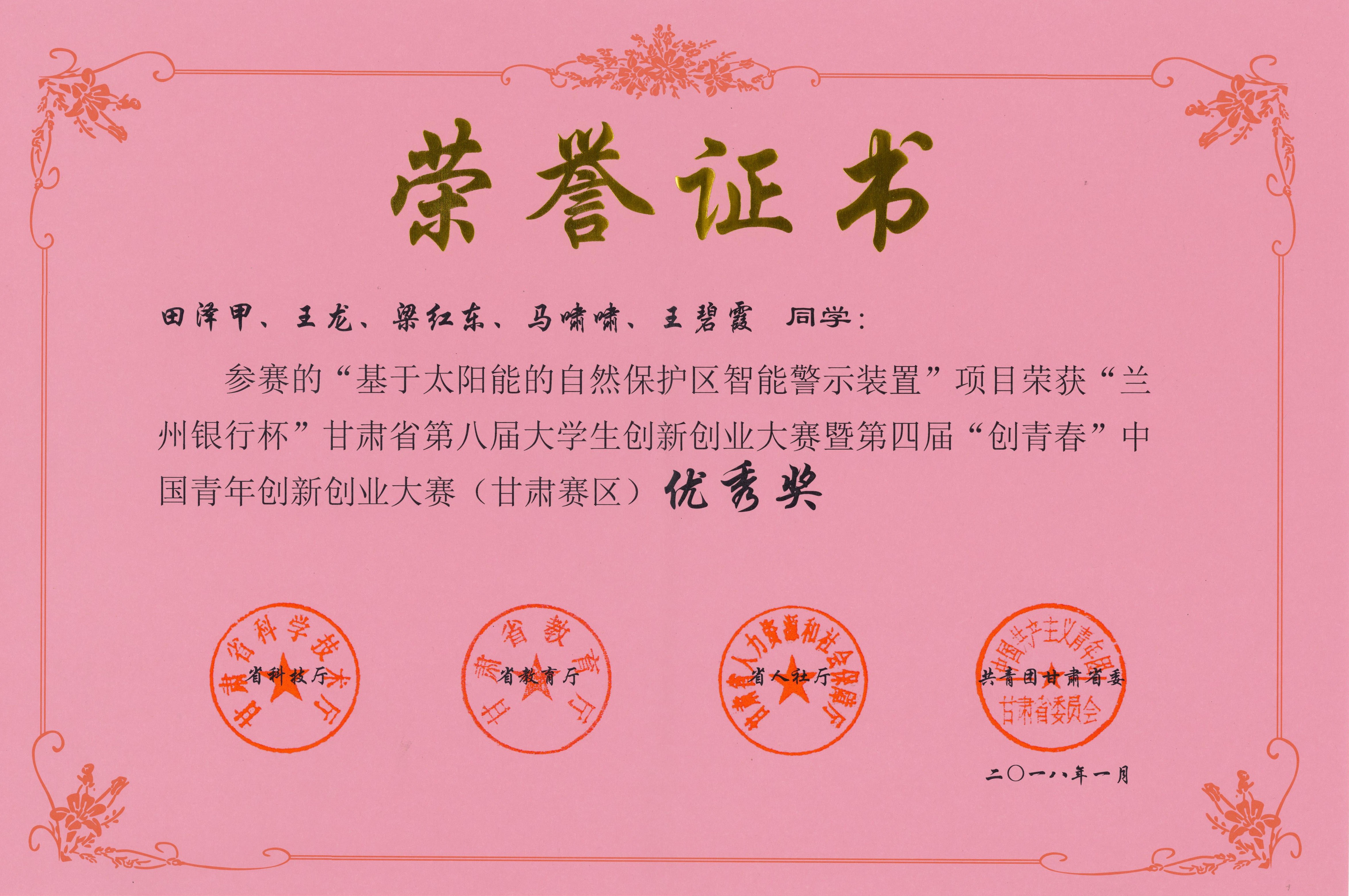 近日,從省教育廳、省科技廳、省人力資源和社會保障廳、共青團(tuán)甘肅省委聯(lián)合下發(fā)的《關(guān)于公布“蘭州銀行杯”甘肅省第八屆大學(xué)生創(chuàng)新創(chuàng)業(yè)大賽暨第四屆“創(chuàng)青春”中國青年創(chuàng)新創(chuàng)業(yè)大賽(甘肅賽區(qū))獲獎名單的通知》中獲知,在今年1月7日舉辦的“蘭州銀行杯”甘肅省第八屆大學(xué)生創(chuàng)新創(chuàng)業(yè)大賽暨第四屆“創(chuàng)青春”中國青年創(chuàng)新創(chuàng)業(yè)大賽(甘肅賽區(qū))中,我院選送的“基于太陽能的自然保護(hù)區(qū)智能警示裝置”項(xiàng)目獲得優(yōu)秀獎。