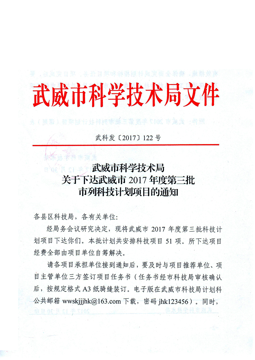 轉(zhuǎn)發(fā)武威市科學技術(shù)局關(guān)于下達武威市2017年度第三批市列科技計劃項目的通知