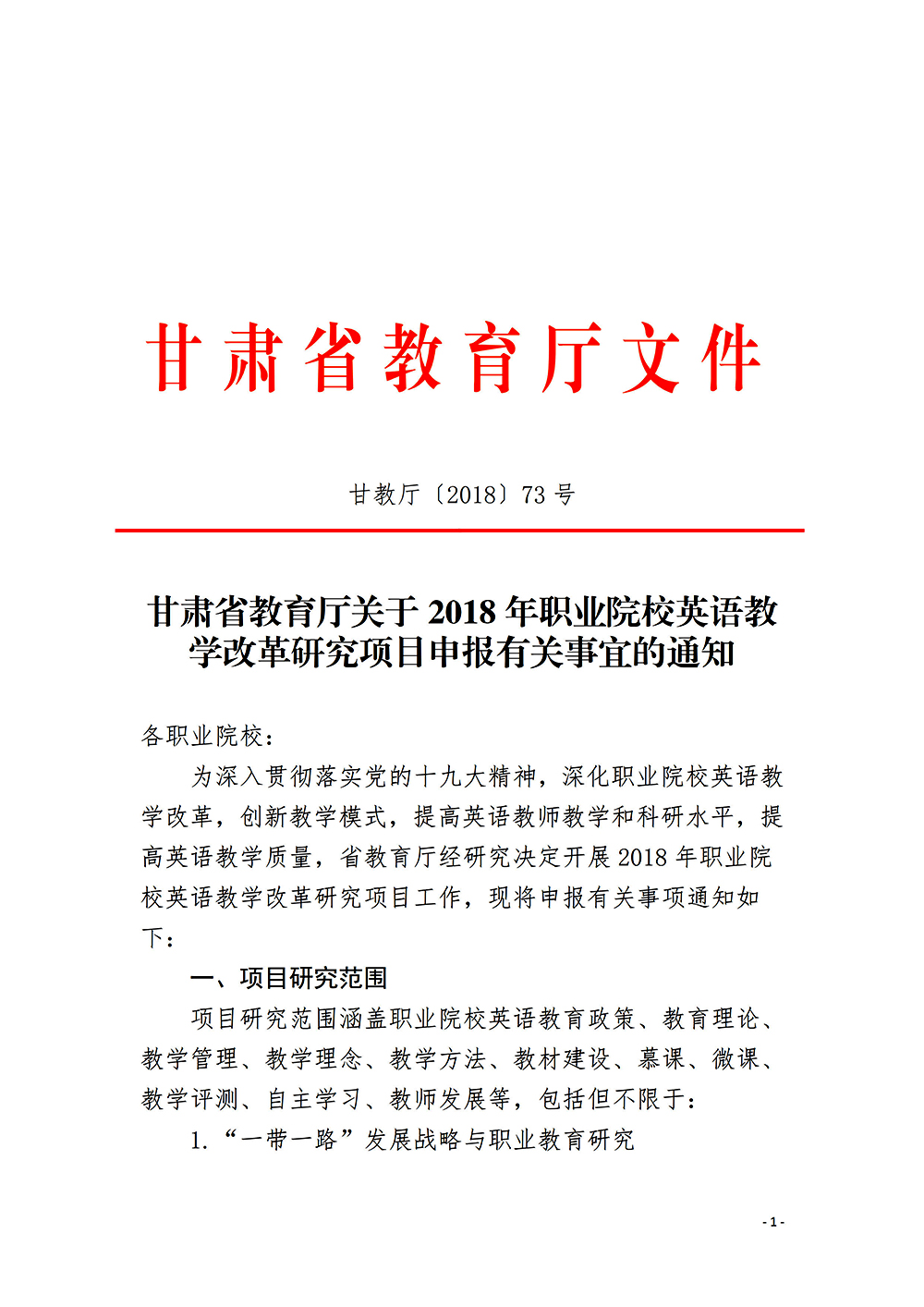 轉(zhuǎn)發(fā)甘肅省教育廳關(guān)于申報(bào)2018年職業(yè)院校英語(yǔ)教學(xué)改革研究項(xiàng)目的通知