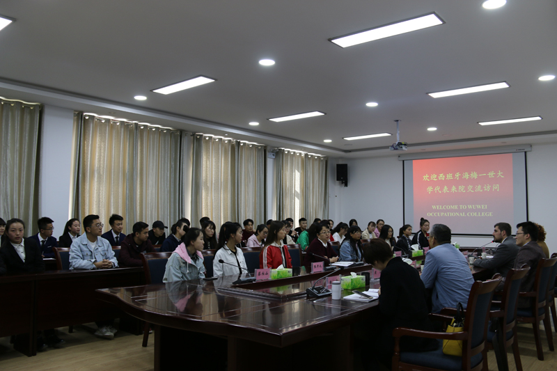 座談會(huì)上,田迎春代表全院師生對(duì)海梅一世大學(xué)到訪學(xué)院表示歡迎,對(duì)省國際交流與合作服務(wù)中心對(duì)學(xué)院的關(guān)心表示感謝,并向來訪客人簡要介紹了武威文化歷史、學(xué)院建設(shè)發(fā)展情況、學(xué)院國際交流與合作開展情況。來訪客人對(duì)學(xué)院近年來的巨大發(fā)展表示贊賞,對(duì)學(xué)院國際交流與合作開展工作表示肯定。Ana女士通過PPT展示介紹了海梅一世大學(xué),希望雙方進(jìn)一步進(jìn)行合作。賓主雙方還就校際交流、語言培訓(xùn)、赴西班牙專升碩留學(xué)項(xiàng)目等共同關(guān)心的問題進(jìn)行了深入交流。