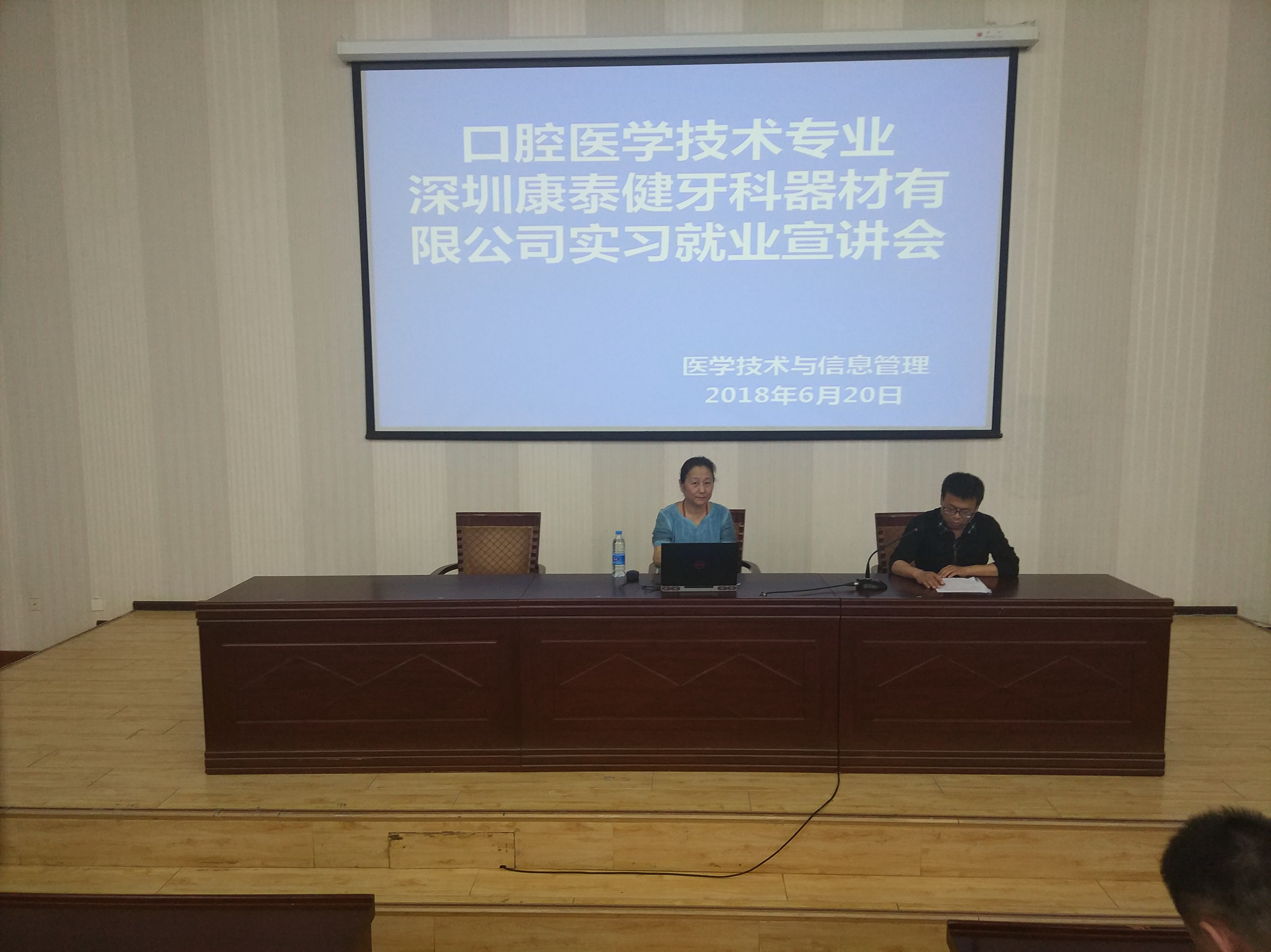 6月20日,醫(yī)學技術(shù)學院邀請深圳市康泰健牙科器材有限公司在正德廳召開企業(yè)實習就業(yè)宣講。參加宣講會的有康泰健牙科器材有限公司培訓學校校長辛金紅、口腔技術(shù)專業(yè)教研室全體老師、在校口腔醫(yī)學技術(shù)專業(yè)學生,宣講會由系副主任蔡濟眾主持。