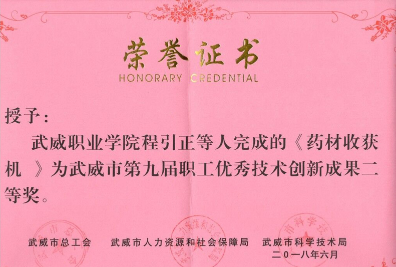 近日,武威市總工會、武威市人力資源和社會保障局、武威市科學(xué)技術(shù)局在全市企事業(yè)單位和廣大職工中廣泛開展了征集評選職工優(yōu)秀技術(shù)創(chuàng)新成果活動。經(jīng)過逐級推薦、專家評審、網(wǎng)絡(luò)公示等程序,我系教師程引正等完成的《藥材收獲機(jī)》喜獲武威市第九屆職工優(yōu)秀技術(shù)創(chuàng)新成果二等獎。