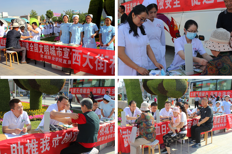 為保障臨床用血安全,給我市創(chuàng)建全國文明城市活動(dòng)增亮添彩,由武威市衛(wèi)生計(jì)生委、武威市紅十字會(huì)主辦,武威市中心血站承辦的“世界無償獻(xiàn)血者日”大型宣傳、義診、獻(xiàn)血活動(dòng)于6月14日在武威市文化廣場隆重舉行。學(xué)院附屬醫(yī)院醫(yī)護(hù)人員、學(xué)院紅十字志愿者方隊(duì)、無償獻(xiàn)血獲獎(jiǎng)?wù)叻疥?duì)等30余家單位的干部群眾參加了活動(dòng)。