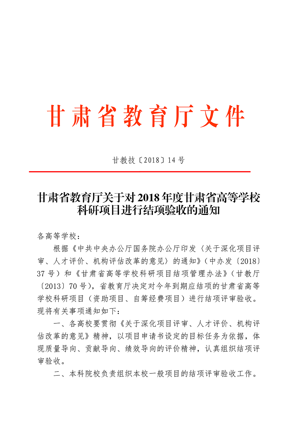 轉(zhuǎn)發(fā)甘肅省教育廳關(guān)于對2018年度甘肅省高等學(xué)校科研項目進行結(jié)項驗收的通知