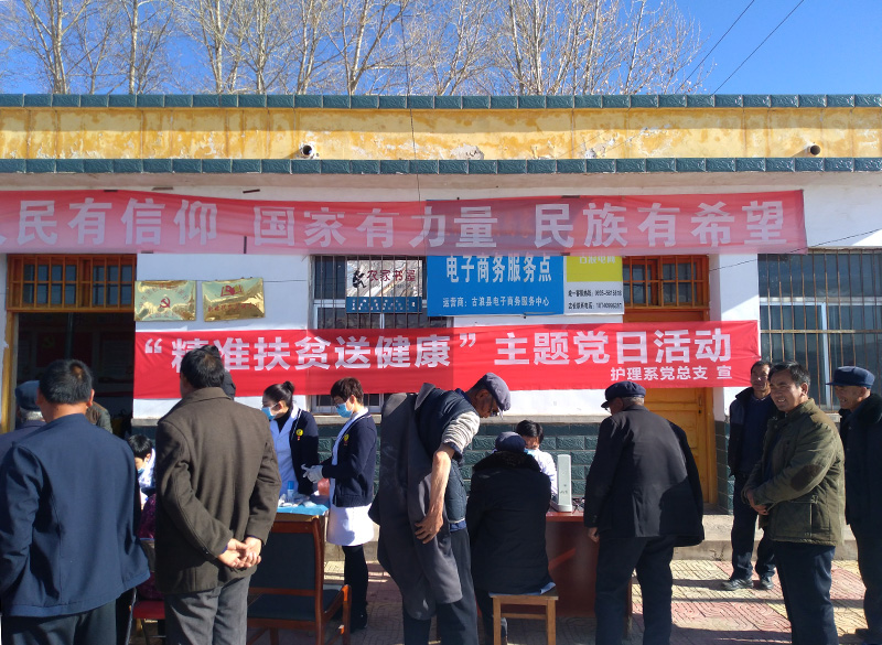 為深入學(xué)習(xí)宣傳貫徹黨的十九大精神及健康扶貧等惠民政策,減少出現(xiàn)“因病致貧”、“因病返貧”,11月23日,護理系黨總支組織黨員教師到我院精準(zhǔn)扶貧點古浪縣黑松驛鎮(zhèn)尚家臺村開展“健康扶貧,送醫(yī)送藥”主題黨日活動。