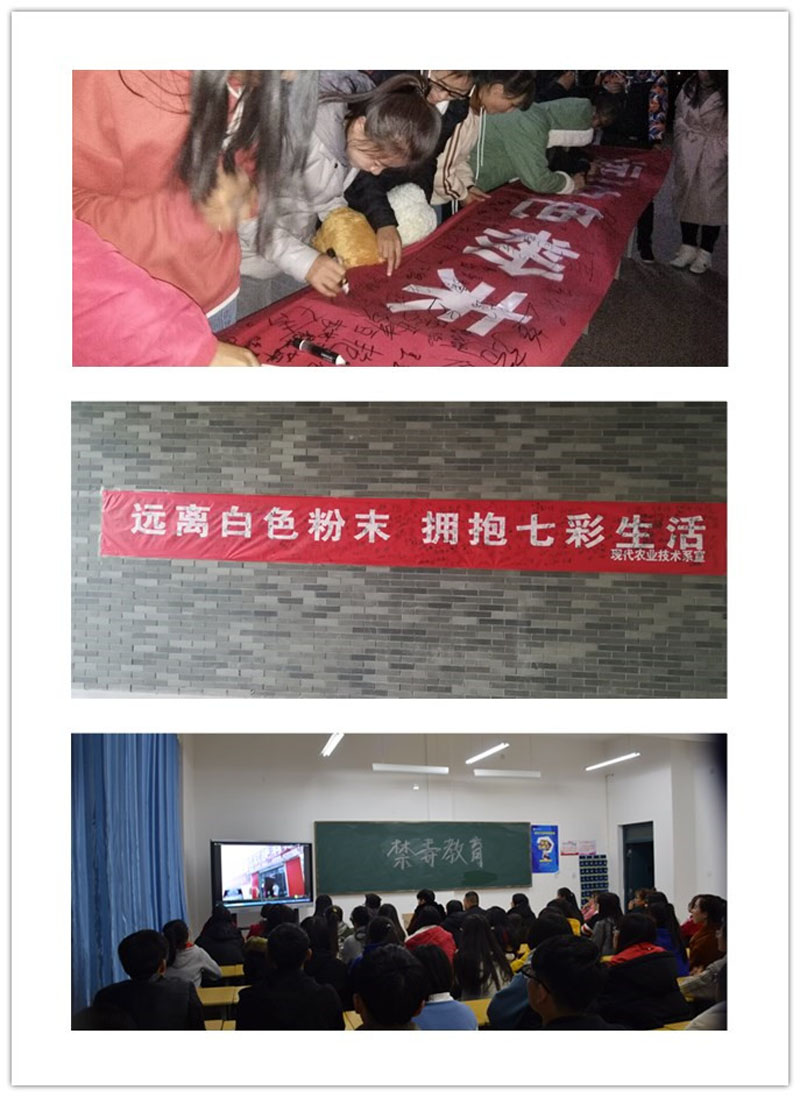 現(xiàn)代農(nóng)業(yè)技術(shù)系結(jié)合自身實(shí)際和條件,重點(diǎn)開展了以下活動(dòng)。一是通過在行樹樓張貼“遠(yuǎn)離白色粉末擁抱七彩生活”禁毒橫幅,號(hào)召全系師生創(chuàng)建和諧、文明、無毒的校園環(huán)境;二是各班開展了禁毒宣傳主題班會(huì),宣傳毒品危害,普及防毒知識(shí),警示大家珍愛生命,遠(yuǎn)離毒品;三是組織學(xué)生參加學(xué)院禁毒征文大賽,用語言表達(dá)禁毒的決心;四是團(tuán)學(xué)會(huì)組織各班同學(xué)網(wǎng)上參觀“中國禁毒數(shù)字展覽館”,觀看禁毒題材的優(yōu)秀微電影《一路有你》、《少年的秘密》、《蛻變》、《愛心帶你回家》,讓在場(chǎng)同學(xué)深刻感受到毒品的危害,堅(jiān)定了同學(xué)們禁毒防毒的信心。