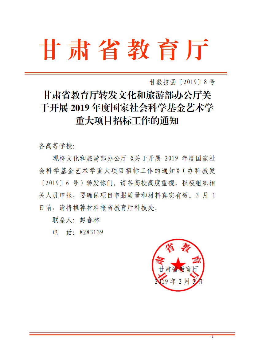 甘肅省教育廳轉(zhuǎn)發(fā)文化和旅游部辦公廳關(guān)于開(kāi)展2019年度國(guó)家社會(huì)科學(xué)基金藝術(shù)學(xué)重大項(xiàng)目招標(biāo)工作的通知