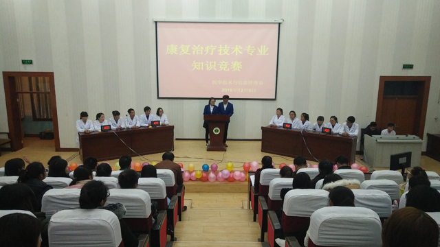 為加強(qiáng)學(xué)風(fēng)建設(shè),鞏固特色專業(yè)建設(shè)成果,增強(qiáng)同學(xué)們對(duì)專業(yè)知識(shí)的了解,培養(yǎng)同學(xué)們的思維能力、創(chuàng)新能力,提高學(xué)生的競(jìng)爭(zhēng)力,12月5日晚,醫(yī)學(xué)技術(shù)與信息管理系在尚德樓正德廳舉行康復(fù)治療技術(shù)專業(yè)知識(shí)競(jìng)賽。學(xué)院基建處處長(zhǎng)周興全,系主任楊如松,學(xué)生工作負(fù)責(zé)人魏曙光,院團(tuán)委馬琪老師,系政治輔導(dǎo)員,康復(fù)治療技術(shù)專業(yè)教研室主任、任課教師及全體班主任、學(xué)生代表參加本次活動(dòng)。
