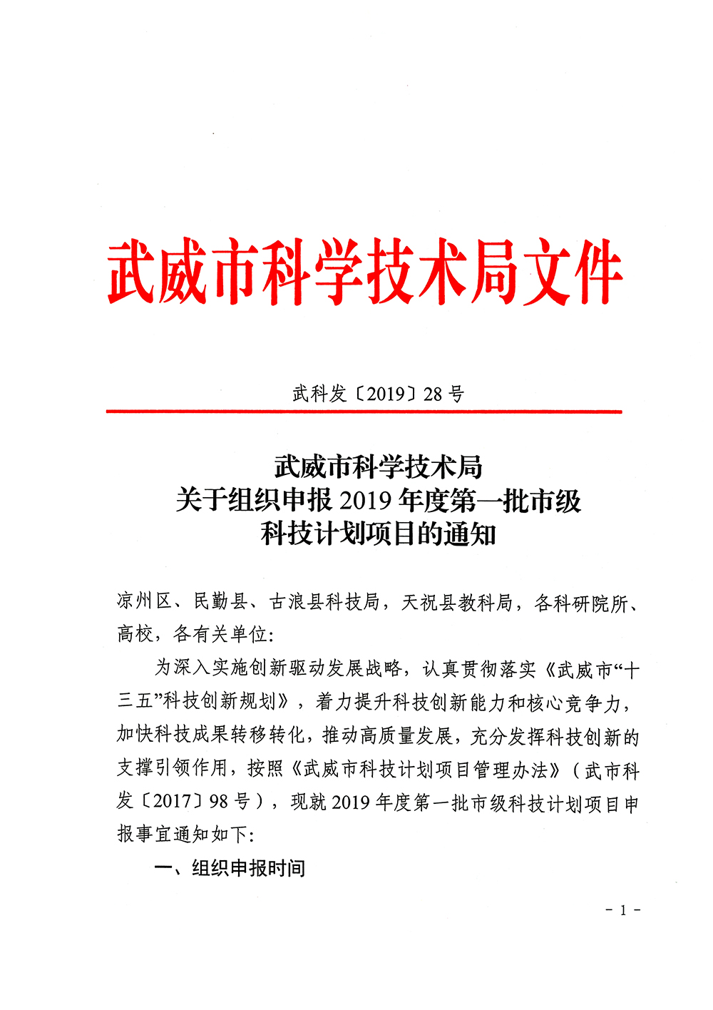 轉(zhuǎn)發(fā)武威市科學(xué)技術(shù)局關(guān)于組織申報(bào)2019年度第一批市級(jí)科技計(jì)劃項(xiàng)目的通知
