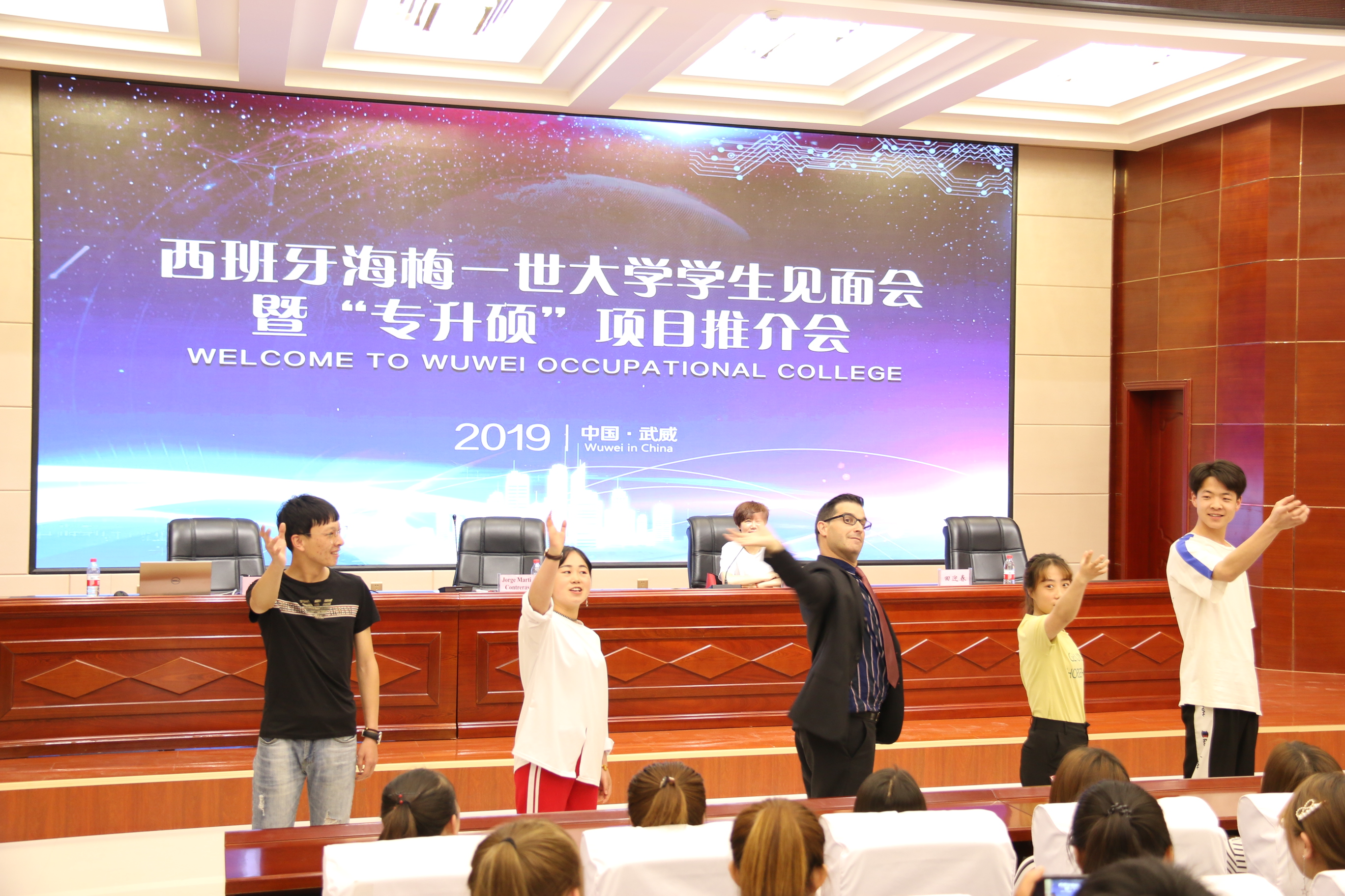 西班牙客人還到菁英廳參加了學(xué)院組織的學(xué)生見面會。Contreras 先生和同學(xué)們進(jìn)行了語言、歌曲、舞蹈雙向互動,讓在場所有同學(xué)體驗了濃烈的西班牙異域文化,同學(xué)們近距離感受了西班牙客人的熱情奔放、幽默詼諧。Contreras 先生對學(xué)院學(xué)生的積極主動、大膽參與互動留下了深刻印象。護(hù)理系、人文藝術(shù)教育系、能源工程系、電子信息工程系等系學(xué)生代表參加活動。
