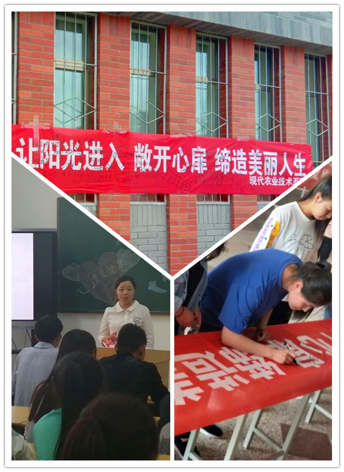 邀請(qǐng)現(xiàn)代農(nóng)業(yè)技術(shù)系張曉燕老師做了題為《預(yù)見未知的自己》的講座;系團(tuán)學(xué)會(huì)組織學(xué)生參加“打開心靈的窗戶,讓陽(yáng)光進(jìn)入;敞開心扉,締造美麗人生?!敝黝}簽名活動(dòng)。各班召開心理健康主題班會(huì)、開展心理游戲和手抄報(bào)活動(dòng)。