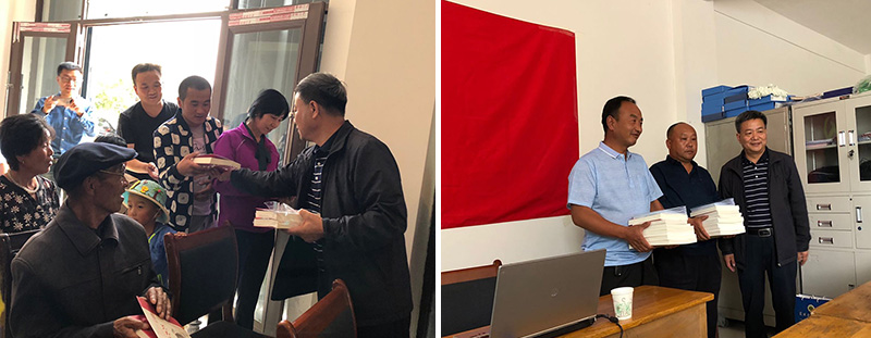 課后,學院領(lǐng)導把《習近平新時代中國特色社會主義思想學習綱要》《習近平新時代中國特色社會主義思想三十講》《全國優(yōu)秀共產(chǎn)黨員風采錄》《新時代黨支部規(guī)范化建設(shè)工作實用手冊》和“掃黑除惡”知識手冊等14類50多冊黨建書籍分別贈送給蘆草溝村、尚家臺村黨支部和駐村工作隊,還向聽課的村民黨員贈送《習近平的七年知青歲月》等書籍。進村入戶的幫扶干部向幫扶戶村民黨員贈送了黨建書籍。共贈送100多冊價值2700多元黨建書籍和掃黑除惡手冊。