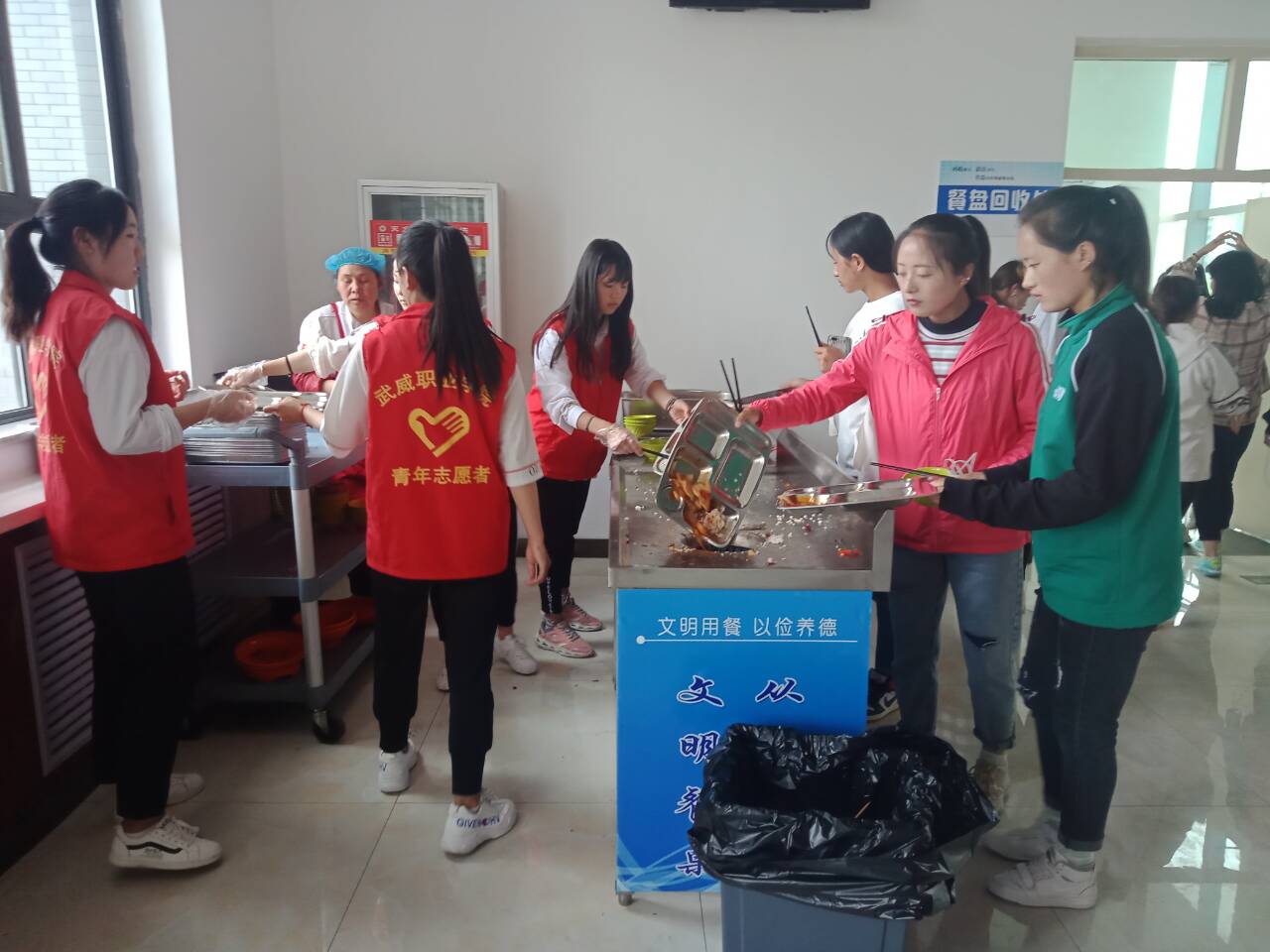 為了規(guī)范學(xué)生用餐禮儀,培養(yǎng)良好的用餐習(xí)慣,人文藝術(shù)教育系志愿者于5月31日在一號食堂和二號食堂分別進行了“自覺回收餐盤,文明用餐”的志愿服務(wù)活動,在負(fù)責(zé)人的組織下同學(xué)們禮貌待人,溫馨提示同學(xué)們回收餐盤,于己方便,更是與人方便。
