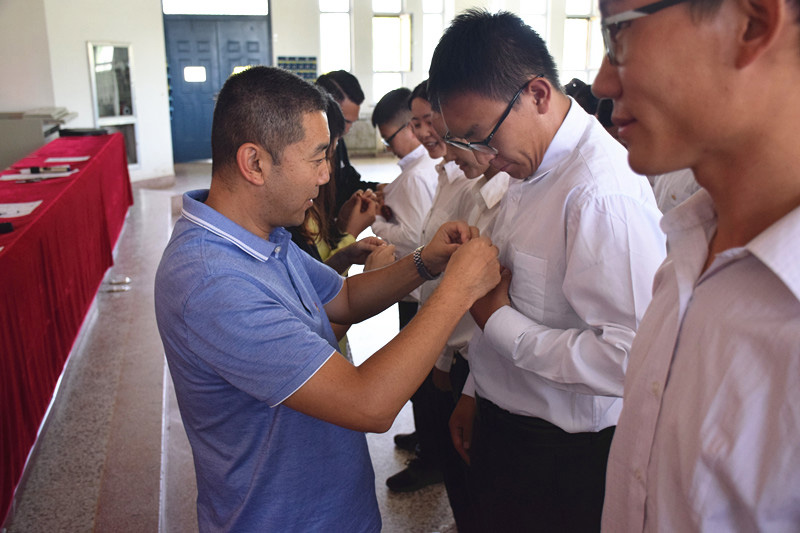 羅小勇為新黨員佩戴黨徽,并代表學(xué)院黨委對新入黨的56名預(yù)備黨員表示熱烈的祝賀和歡迎。他強調(diào),作為預(yù)備黨員,一要恪守入黨誓詞,踐行莊嚴(yán)承諾,堅定不移地從思想和行動上與黨組織保持高度一致,牢固樹立“四個意識”,增強“四個自信”,堅決做到“兩個維護(hù)”,激發(fā)奮發(fā)向上的學(xué)習(xí)、生活和工作熱情,努力營造踏實務(wù)實的學(xué)習(xí)氛圍;二要充分發(fā)揮先鋒模范作用,在各自的學(xué)習(xí)生活中體現(xiàn)黨的先進(jìn)性,成為同學(xué)中的旗幟標(biāo)桿力量;三要牢記全心全意為人民服務(wù)的宗旨,努力實踐,立志成為中國特色社會主義事業(yè)奮斗終身的有用人才。