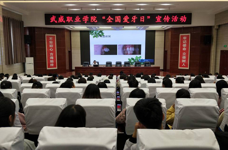 學(xué)院婦聯(lián)邀請(qǐng)武威腫瘤醫(yī)院口腔科主任韓冬做題為《青年口腔保健知識(shí)》的講座。韓冬結(jié)合多年口腔疾病診療經(jīng)驗(yàn),從青年口腔衛(wèi)生、口腔疾病預(yù)防及口腔正畸處理等方面入手,做了精彩講解,借助牙齒道具展示了正確的刷牙方法,并對(duì)同學(xué)們的各類口腔問(wèn)題作了解答。講座結(jié)束后,武威腫瘤醫(yī)院和愛(ài)牙協(xié)會(huì)在大學(xué)生活動(dòng)中心前廣場(chǎng)為同學(xué)們開(kāi)展義診活動(dòng),發(fā)放口腔健康宣傳資料600余份。