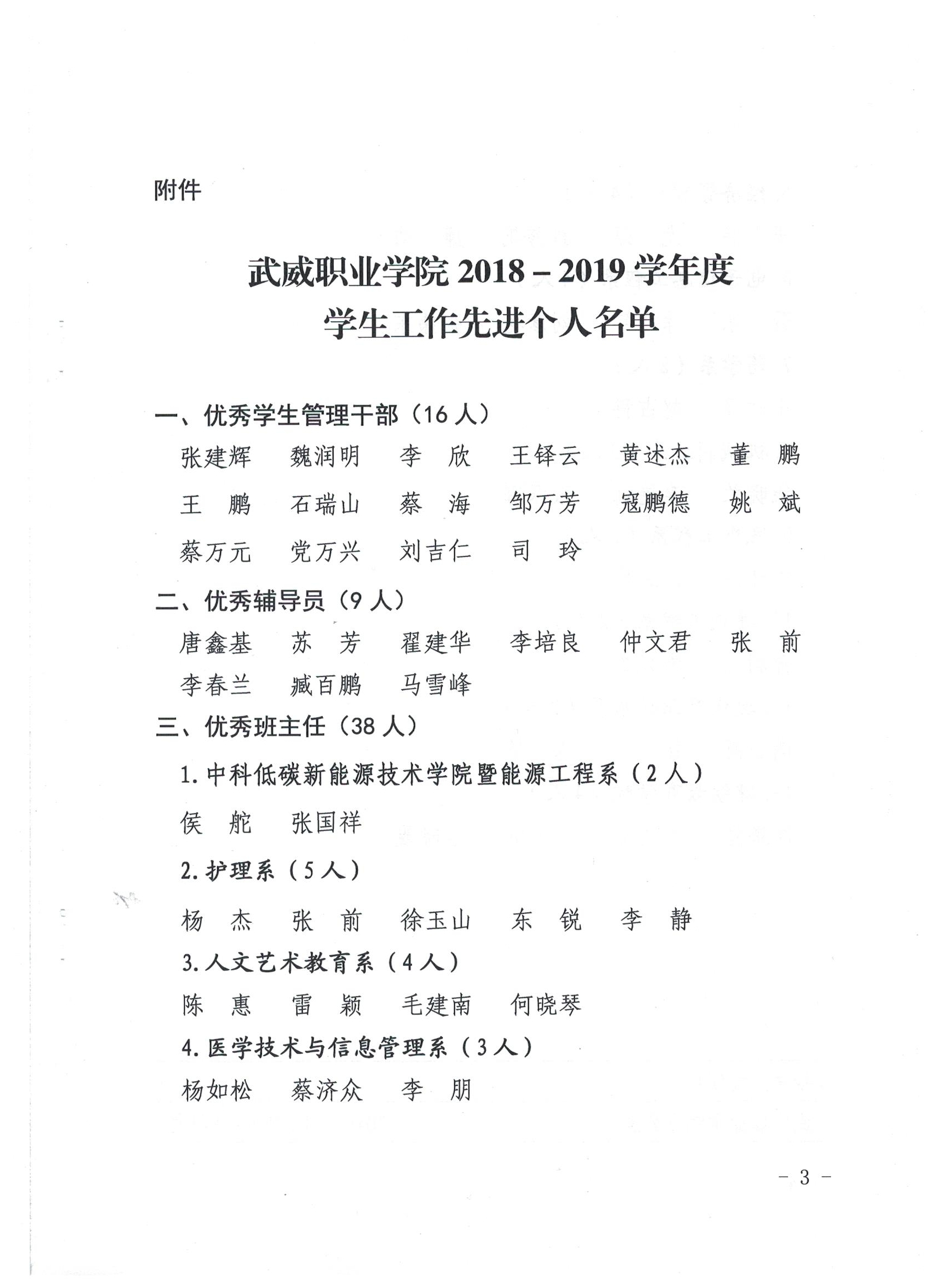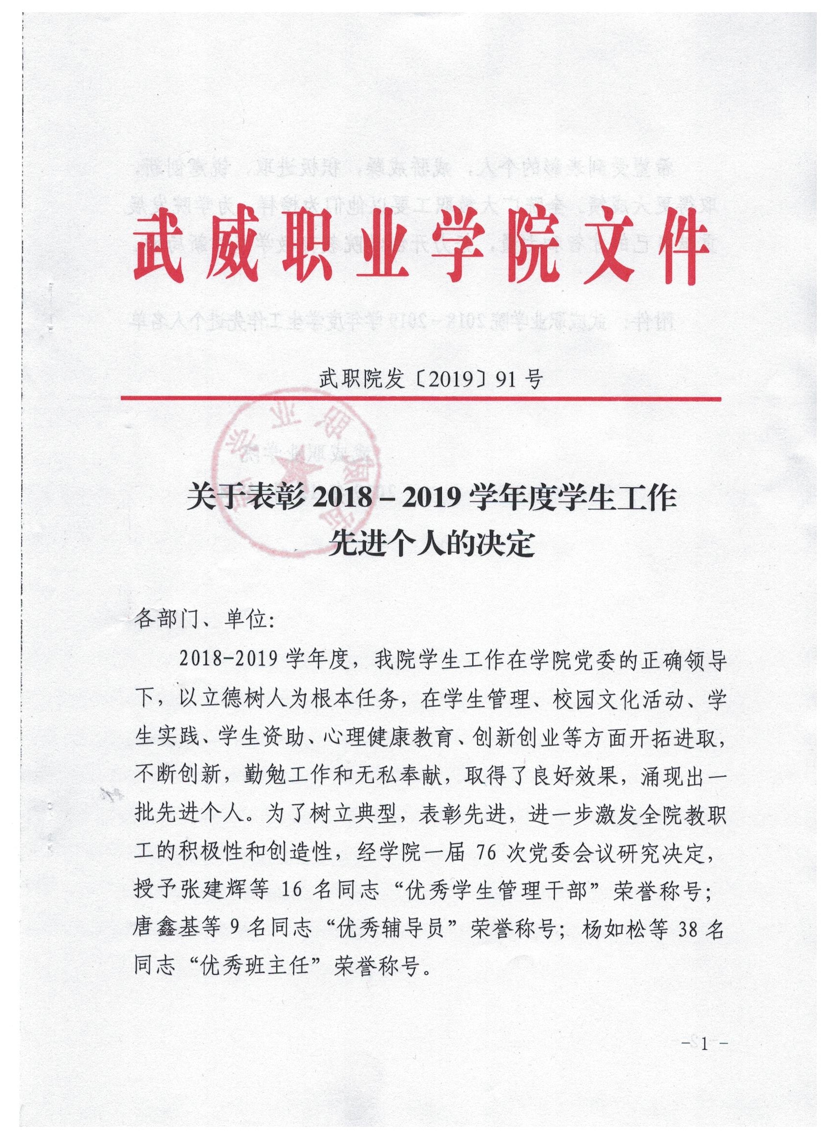 關于表彰2018-2019學年度學生工作先進個人的決定