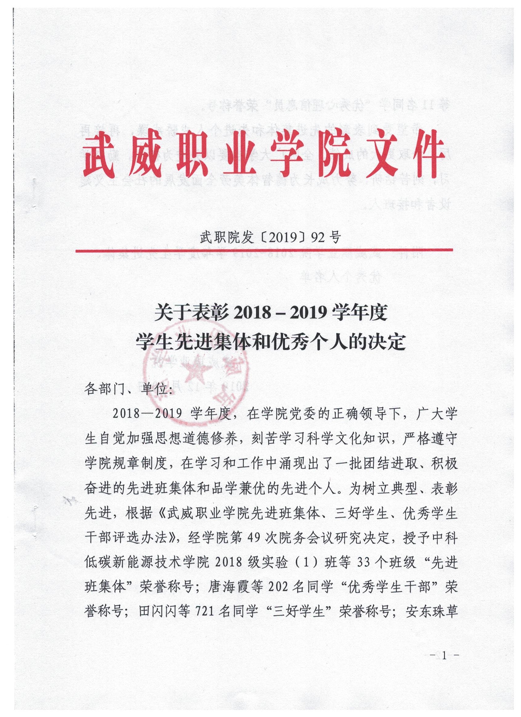 關于表彰2018-2019學年度學生先進集體和優(yōu)秀個人的決定
