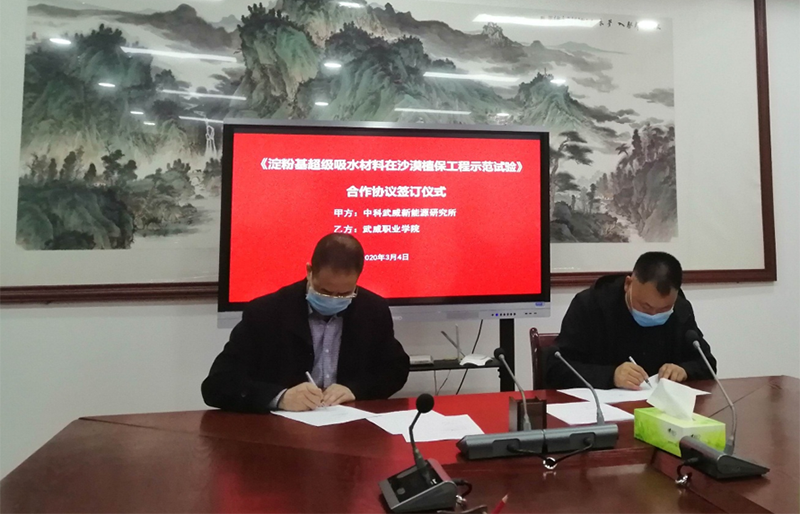 武威職業(yè)學院與中科武威新能源研究所舉行《淀粉基超級吸水材料在沙漠植保工程示范試驗》科研項目合作協(xié)議簽訂會議