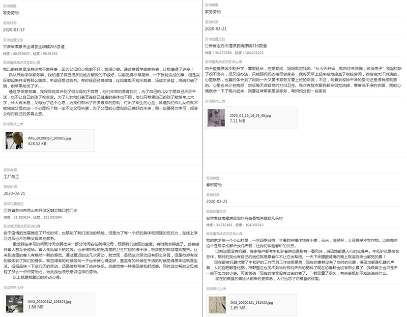 結(jié)合同學(xué)們生活和學(xué)習(xí)實(shí)際,學(xué)工處要求廣大同學(xué)積極參與志愿服務(wù)、春耕勞動、工廠務(wù)工、家務(wù)勞動等方面勞動實(shí)踐,完成每周不少于2小時的實(shí)踐鍛煉,并通過信息化平臺上報活動照片和勞動心得。
