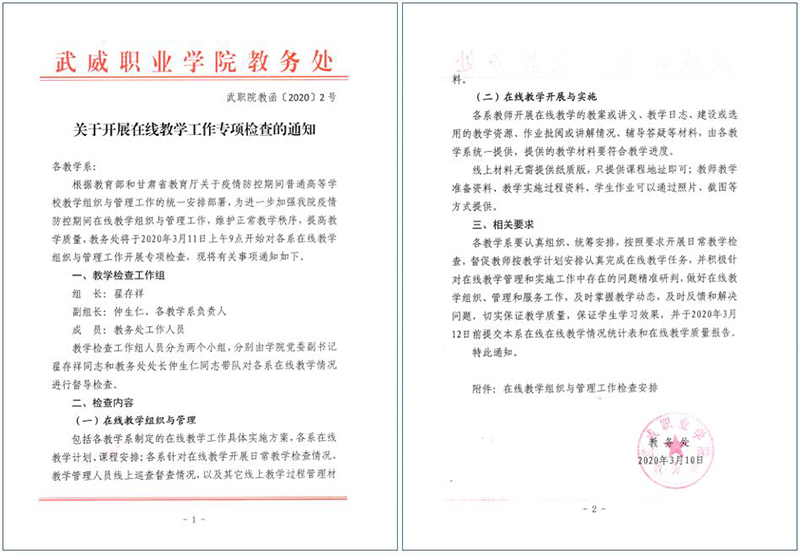各院系及相關(guān)部門要按照教育部和省教育廳關(guān)于疫情防控期間在線教學(xué)工作的文件精神和《武威職業(yè)學(xué)院新型冠狀病毒肺炎疫情防控期間在線教學(xué)工作實(shí)施方案》的相關(guān)要求進(jìn)行全面自查,做到文件精神及要求全部落實(shí)到位、不打折扣;對執(zhí)行情況進(jìn)行認(rèn)真總結(jié),通過自查深入挖掘現(xiàn)階段在線教學(xué)實(shí)施和組織管理過程中的重點(diǎn)問題,利用各系教研活動和教研團(tuán)隊(duì)推動開展教學(xué)研究和人才培養(yǎng)模式改革研究,全面落實(shí)問題導(dǎo)向,推動在線教學(xué)工作落實(shí)落細(xì)落地。