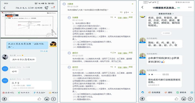 機(jī)械制造系和電信系的教師在課后積極收集學(xué)生的提問或者疑難問題,利用課余或周末的時(shí)間,在家中通過白板講解、紙筆講解的方式利用釘釘群直播講解練習(xí)題,開展互動答疑。