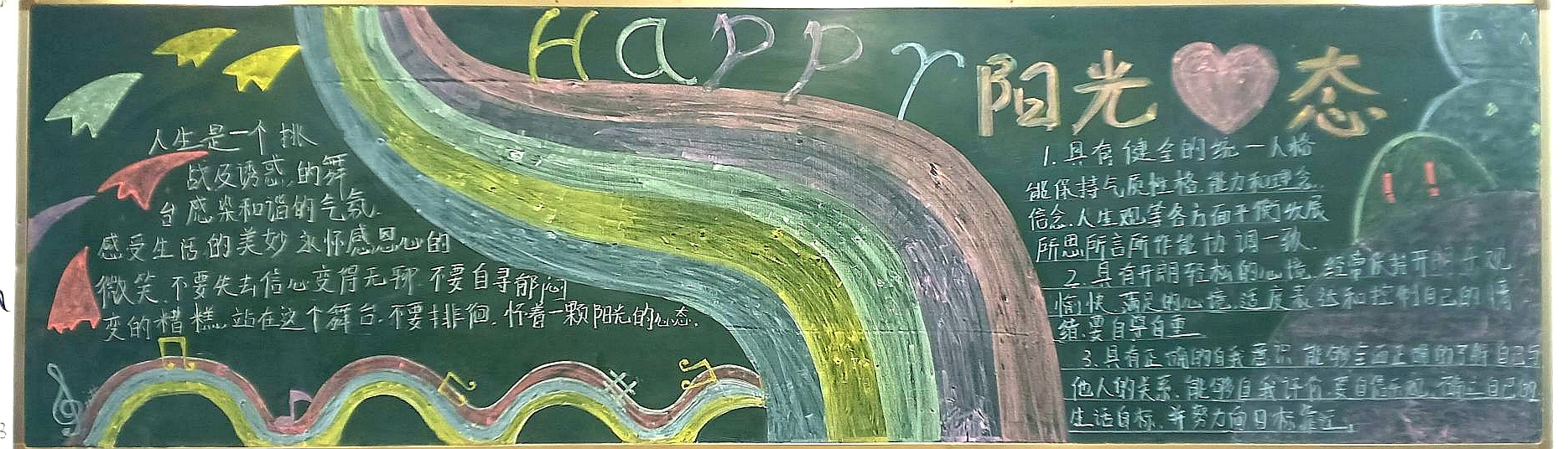 各班設(shè)計了心理手抄報大賽。各級各班的同學(xué)們自己設(shè)計、制作黑板報,普及心理學(xué)知識,宣傳心理健康的理念,突出心理學(xué)的特色,每一份手抄報中都凝結(jié)著同學(xué)們的心血。目前,團委組織正在對黑板報進行緊張的評選。
