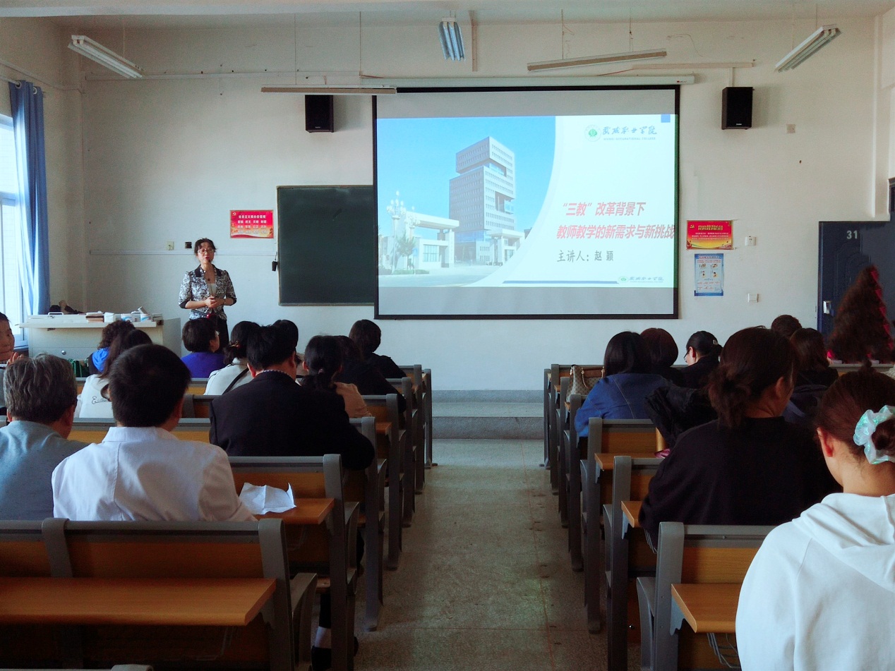 赴揚州參加學習的護理系基礎教研室教師趙穎就8月16日至22日期間的學習內容向大家作了詳細匯報。此次匯報的內容主要包括題目解析和“三教”改革的對策與舉措兩大部分。趙穎借助PPT,通過生動的語言,詳實的例子,結合我系實際情況,分享交流有關《“三教”改革背景下教師教學的新需求與新挑戰(zhàn)》的學習內容,傳遞了職業(yè)教育改革和發(fā)展信息化發(fā)展的方向,介紹了“三教”改革背景下教師教育教學面對的新要求、新挑戰(zhàn)以及教師如何應對這些挑戰(zhàn)并將自己的學習心得體會與大家作了分享。