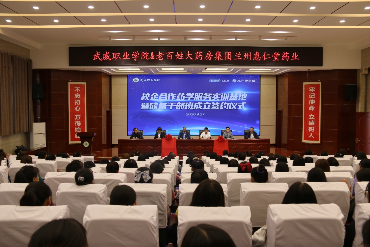 2020年9月27日上午,學(xué)院與老百姓集團﹒蘭州惠仁堂藥業(yè)連鎖有限責(zé)任公司“校企共建藥學(xué)實訓(xùn)基地”暨“老百姓儲備干部班”成立簽約儀式在大學(xué)生活動中心菁英廳舉行。儀式由藥學(xué)系主任魏潤明主持,學(xué)院黨委副書記翟存祥、老百姓集團總部和蘭州惠仁堂藥業(yè)公司相關(guān)領(lǐng)導(dǎo)出席,藥學(xué)系教師代表和2019級藥學(xué)、中藥學(xué)專業(yè)學(xué)生代表共計220人參加了簽約儀式。