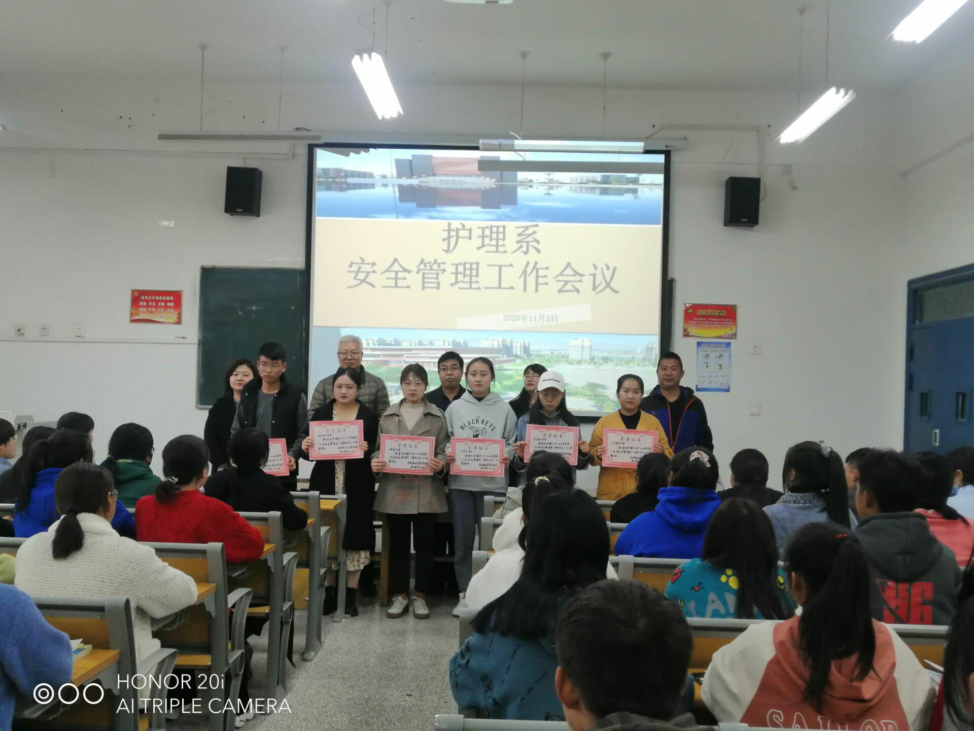 會上,陳鳳平宣讀了《護理系關(guān)于表彰2019-2020學(xué)年度學(xué)生優(yōu)秀安全管理員的決定》,護理系書記張建輝為獲表彰學(xué)生頒發(fā)榮譽證書。張學(xué)軍就近期我系存在的安全隱患問題作了詳細(xì)的說明。張建輝傳達了學(xué)院召開的疫情常態(tài)化防控工作會議內(nèi)容及相關(guān)文件精神,他指出,全系要進一步加強安全隱患排查,尤其是實驗室安全,切實將安全各項工作措施落到實處,預(yù)防安全事故的發(fā)生。他強調(diào),全系師生要進一步加強學(xué)生身體健康監(jiān)測,尤其是每天的晨午檢、日報告、零報告,切實將疫情防控各項工作措施落到實處;倡導(dǎo)文明就餐,增強節(jié)約意識,實施“光盤行動”,杜絕浪費發(fā)生; 持續(xù)做好宿舍、教室及環(huán)境衛(wèi)生掃除,營造良好的學(xué)習(xí)、生活和工作環(huán)境;安全是所有工作的基礎(chǔ)與保障,全體安全員要齊心協(xié)力、攜手努力,除隱患、防火險、保安全、促和諧,為建設(shè)美好校園戮力奮進。