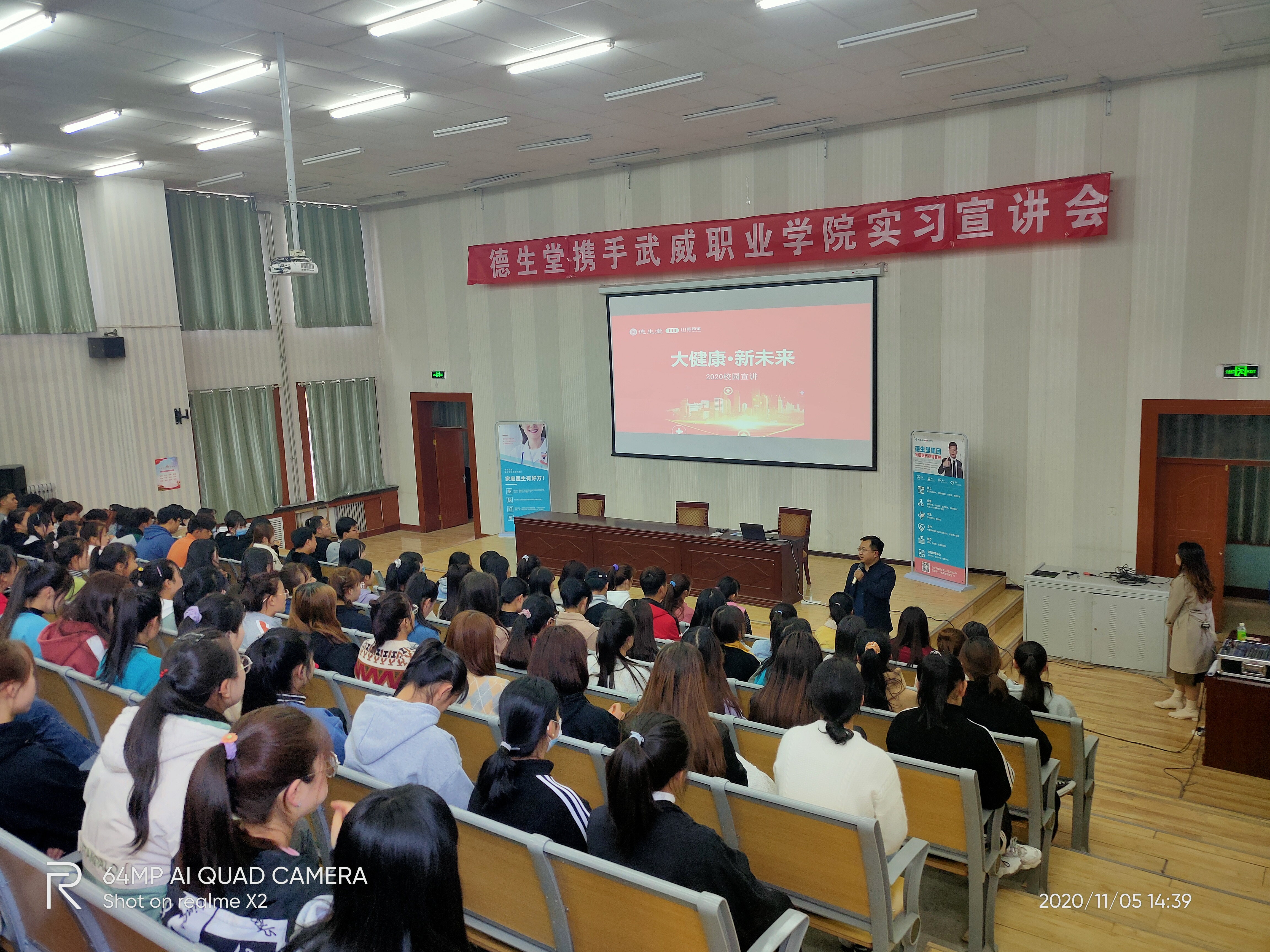 2020年11月5日,武威職業(yè)學院藥學系攜手德生堂在正德廳舉辦實習宣講會。藥學系黨總支書記、主任魏潤明、藥學系副主任楊建美、德生堂集團武威區(qū)域經(jīng)理呂福英及2021屆172名畢業(yè)生參加宣講會。