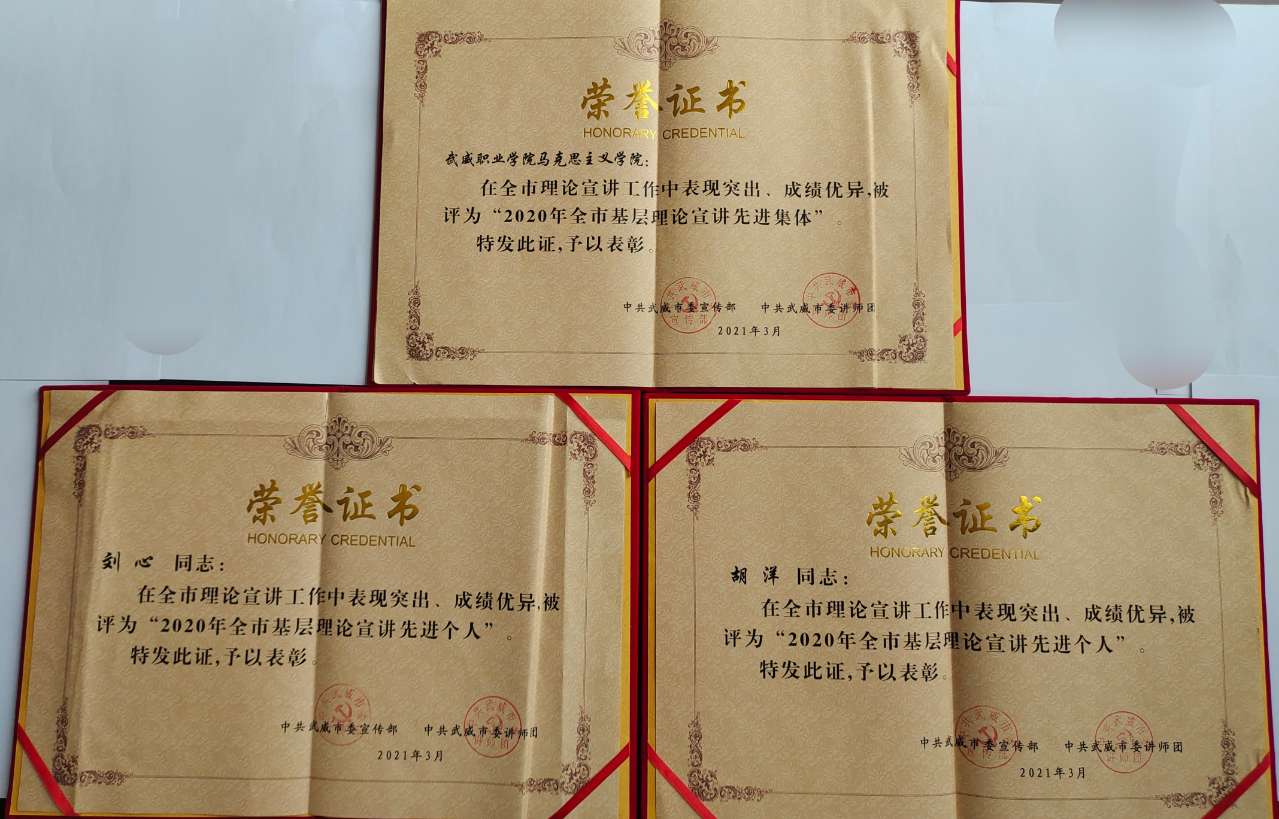 3月25日下午,武威市委宣傳部組織召開了“黨史教育專題宣講動員會暨2020年宣講工作先進集體和個人表彰會”。武威職業(yè)學(xué)院馬克思主義學(xué)院被授予“2020年全市基層理論宣講先進集體”榮譽稱號,同時馬克思主義學(xué)院教師、翟存祥名師工作室成員劉心、胡洋被授予“2020年全市基層理論宣講先進個人”榮譽稱號。