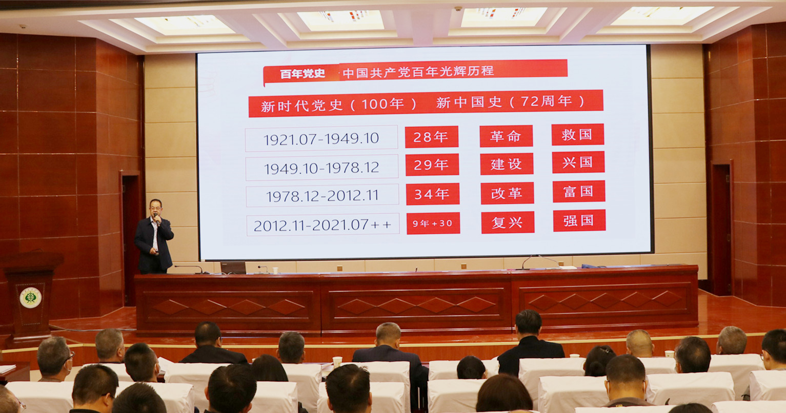 報(bào)告中,翟存祥教授帶領(lǐng)大家再次學(xué)習(xí)了習(xí)近平總書(shū)記在黨史學(xué)習(xí)教育動(dòng)員大會(huì)上的講話,進(jìn)一步明確了開(kāi)展黨史學(xué)習(xí)教育的重大意義。報(bào)告將中國(guó)共產(chǎn)黨百年歷程分為“開(kāi)天辟地,新民主主義革命時(shí)期;改天換地,社會(huì)主義革命和建設(shè)時(shí)期;翻天覆地,改革開(kāi)放和現(xiàn)代化建設(shè)時(shí)期;驚天動(dòng)地,中國(guó)特色社會(huì)主義新時(shí)代”四個(gè)歷史發(fā)展階段。從只有中國(guó)共產(chǎn)黨才能拯救中國(guó),中國(guó)人民站起來(lái)了;只有中國(guó)共產(chǎn)黨才能發(fā)展中國(guó),中國(guó)人民富起來(lái)了;只有中國(guó)共產(chǎn)黨才能治理中國(guó),中國(guó)人民強(qiáng)起來(lái)了;堅(jiān)持中國(guó)共產(chǎn)黨的全面領(lǐng)導(dǎo),新中國(guó)取得巨大成就等四個(gè)方面深刻闡述了中國(guó)共產(chǎn)黨百年奮斗的光輝歷程和取得的偉大成就,系統(tǒng)梳理總結(jié)了黨帶領(lǐng)人民推進(jìn)革命、建設(shè)、改革的寶貴經(jīng)驗(yàn)和長(zhǎng)期奮斗中鑄就的偉大精神。