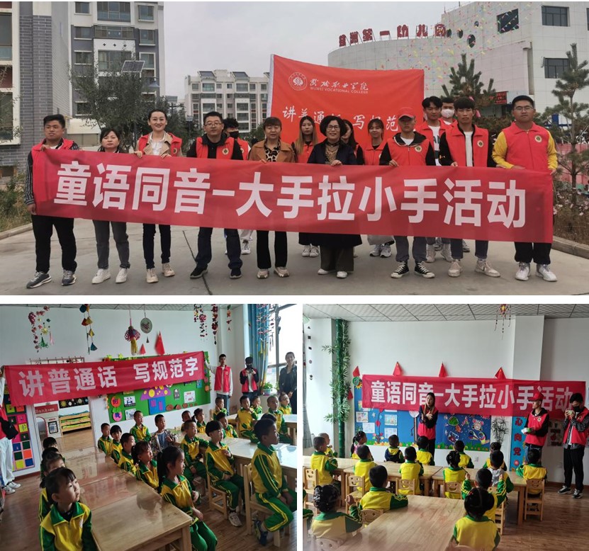 為認真貫徹落實《教育部等九部門關于開展第24屆全國推廣普通話宣傳周活動的通知》(教語用函〔2021〕1號)、《甘肅省語言文字工作委員會等九部門關于開展第24屆全國推廣普通話宣傳周活動的通知》要求,進一步加大國家通用語言文字推廣力度,9月14日,學院推普志愿隊師生在古浪綠洲小鎮(zhèn)第一幼兒園開展童語同音-大手拉小手推普活動,推普志愿隊詳細了解小鎮(zhèn)幼兒教師及兒童的普通話普及情況,并與大、中班幼兒進行了有趣的互動活動。