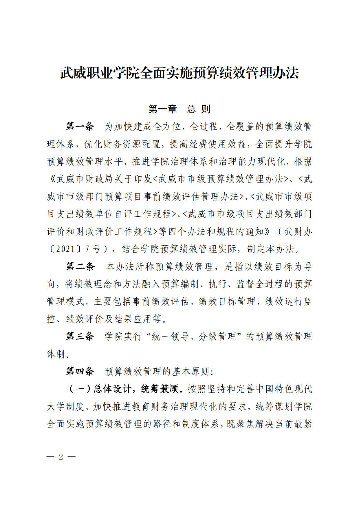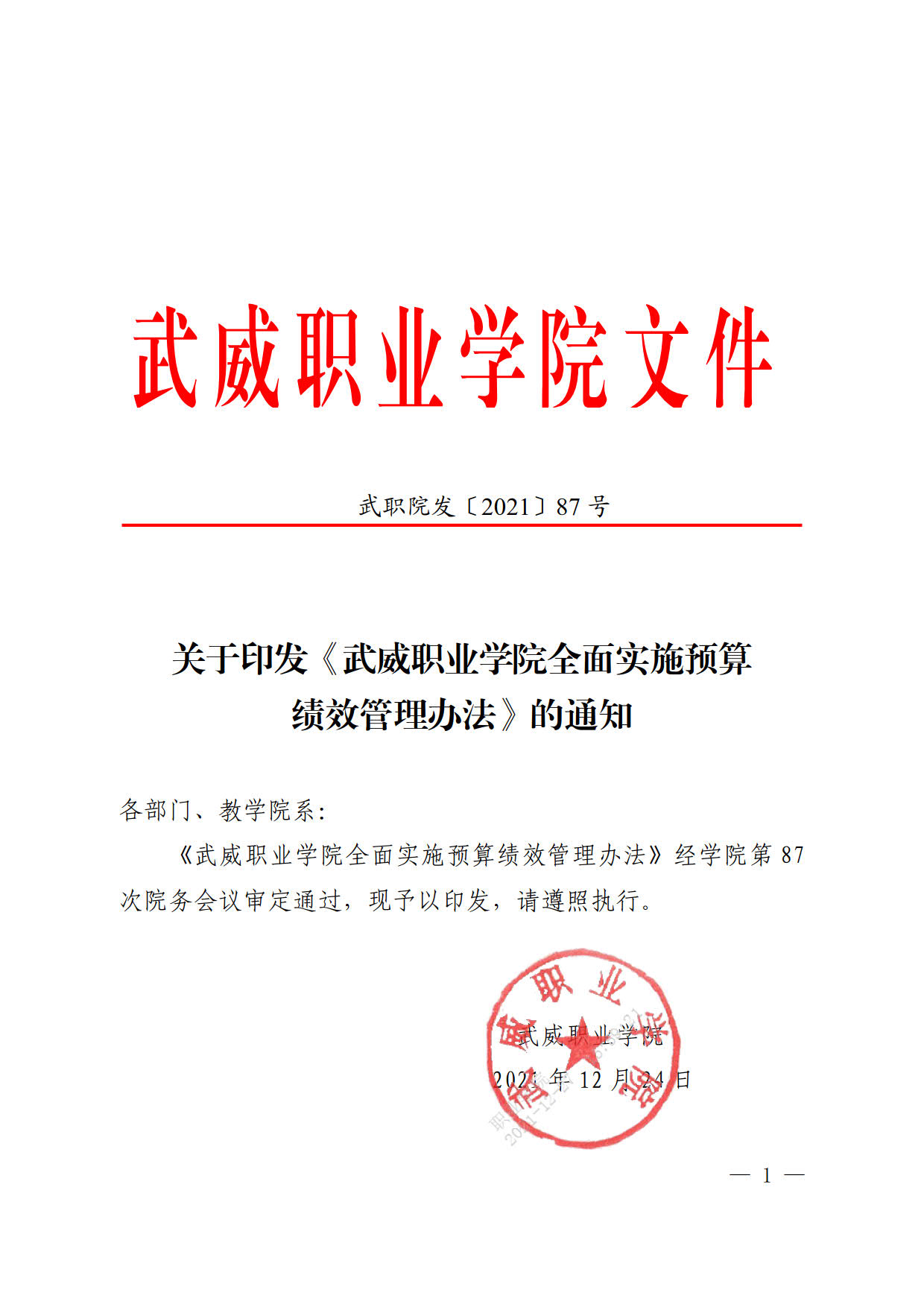 關(guān)于印發(fā)《武威職業(yè)學院全面實施預算績效管理辦法》的通知