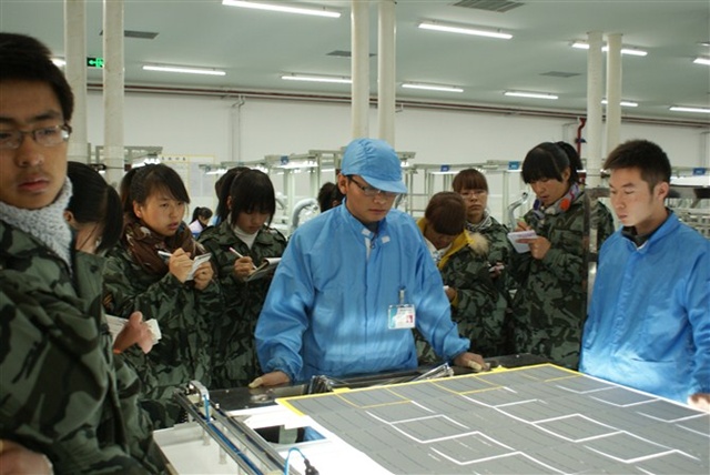 在校外實(shí)訓(xùn)過程中,由工藝部楊經(jīng)理和工藝部文工程師給大家介紹公司情況、公司管理規(guī)范,并帶領(lǐng)大家進(jìn)行參觀,給學(xué)生詳細(xì)講解整個光伏產(chǎn)業(yè)鏈,包括硅片的生產(chǎn)、電池片的生產(chǎn)和太陽能電池組件的生產(chǎn),重點(diǎn)是光伏組件的生產(chǎn)。實(shí)訓(xùn)期間由工廠師傅帶領(lǐng)學(xué)生在車間分組進(jìn)行實(shí)訓(xùn)。依據(jù)光伏組件生產(chǎn)工作流程實(shí)訓(xùn)內(nèi)容分為前道工序和后道工序,前道工序包括:電池片篩選、單焊、串焊、疊層、初檢、EL1測試和層壓;后道工序包括:削邊、裝邊框、裝接線盒、清洗、EL2測試、功率測試、終檢和包裝入庫。同學(xué)們通過親身體驗和輪崗學(xué)習(xí),熟悉了光伏組件的每一道生產(chǎn)工序,對光伏組件的整個生產(chǎn)過程有了一個更加清晰的認(rèn)識和了解。