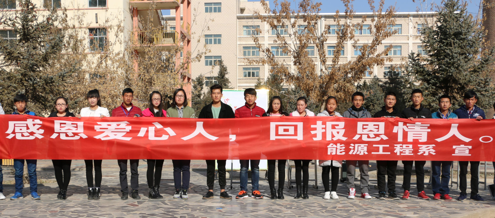 為了成長(zhǎng)為合格的祖國(guó)建設(shè)者,為實(shí)現(xiàn)中國(guó)夢(mèng)。2016年11月24日,武威職業(yè)學(xué)院能源工程系在一號(hào)食堂門口,舉行了以“感恩愛心人,回報(bào)恩情人”為主題的活動(dòng),出席本次活動(dòng)的有能源工程系全體學(xué)生會(huì)成員。