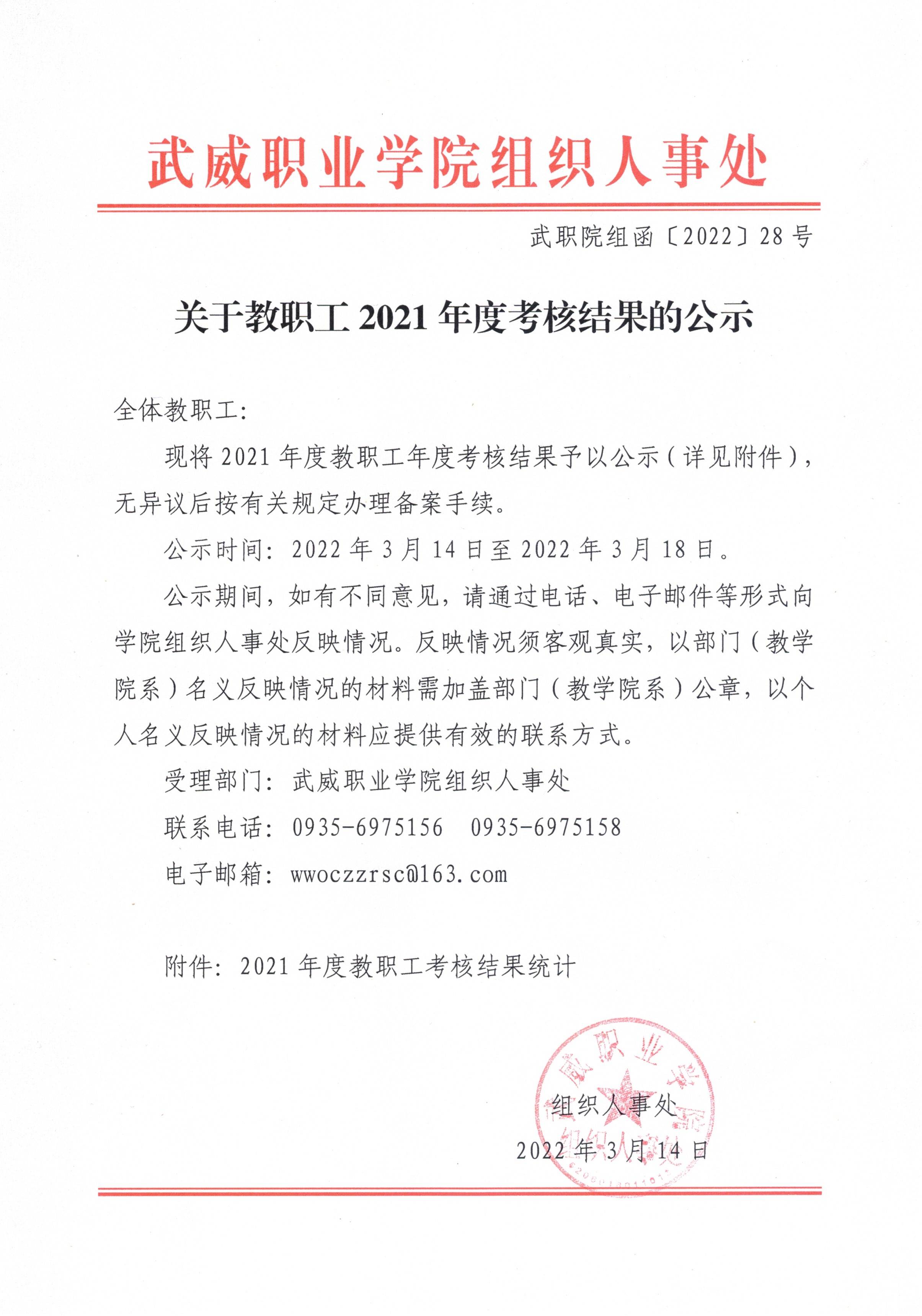 關(guān)于教職工2021年度考核結(jié)果的公示