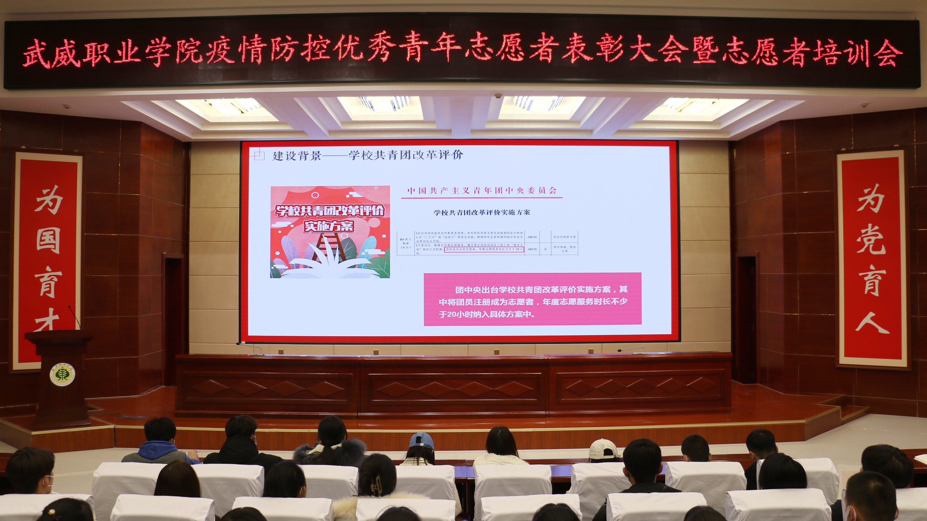 為表彰學(xué)院疫情防控期間涌現(xiàn)出的先進(jìn)典型,弘揚(yáng)偉大的抗疫精神,進(jìn)一步增強(qiáng)學(xué)院青年志愿者協(xié)會(huì)的組織凝聚力和團(tuán)隊(duì)協(xié)作力,院團(tuán)委于12月22日在學(xué)生發(fā)展中心菁英廳召開疫情防控優(yōu)秀青年志愿者表彰大會(huì)暨志愿者培訓(xùn)會(huì),院團(tuán)委全體教師、志愿者代表參加了大會(huì)。