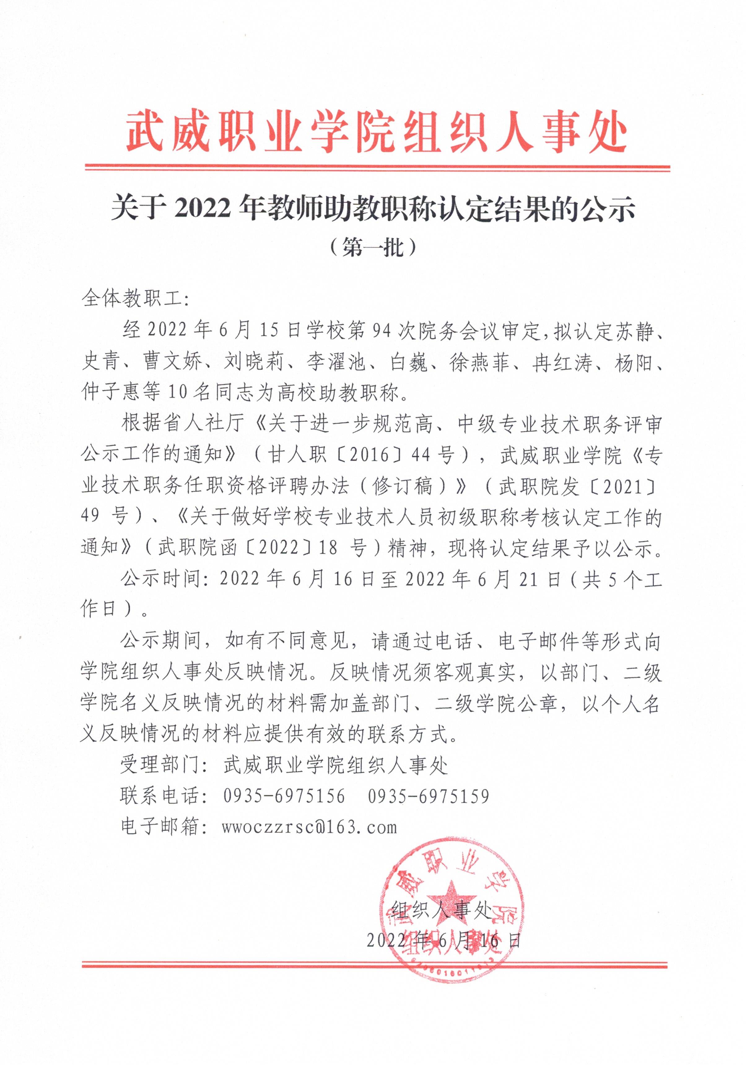 關(guān)于2022年教師助教職稱認定結(jié)果的公示(第一批)