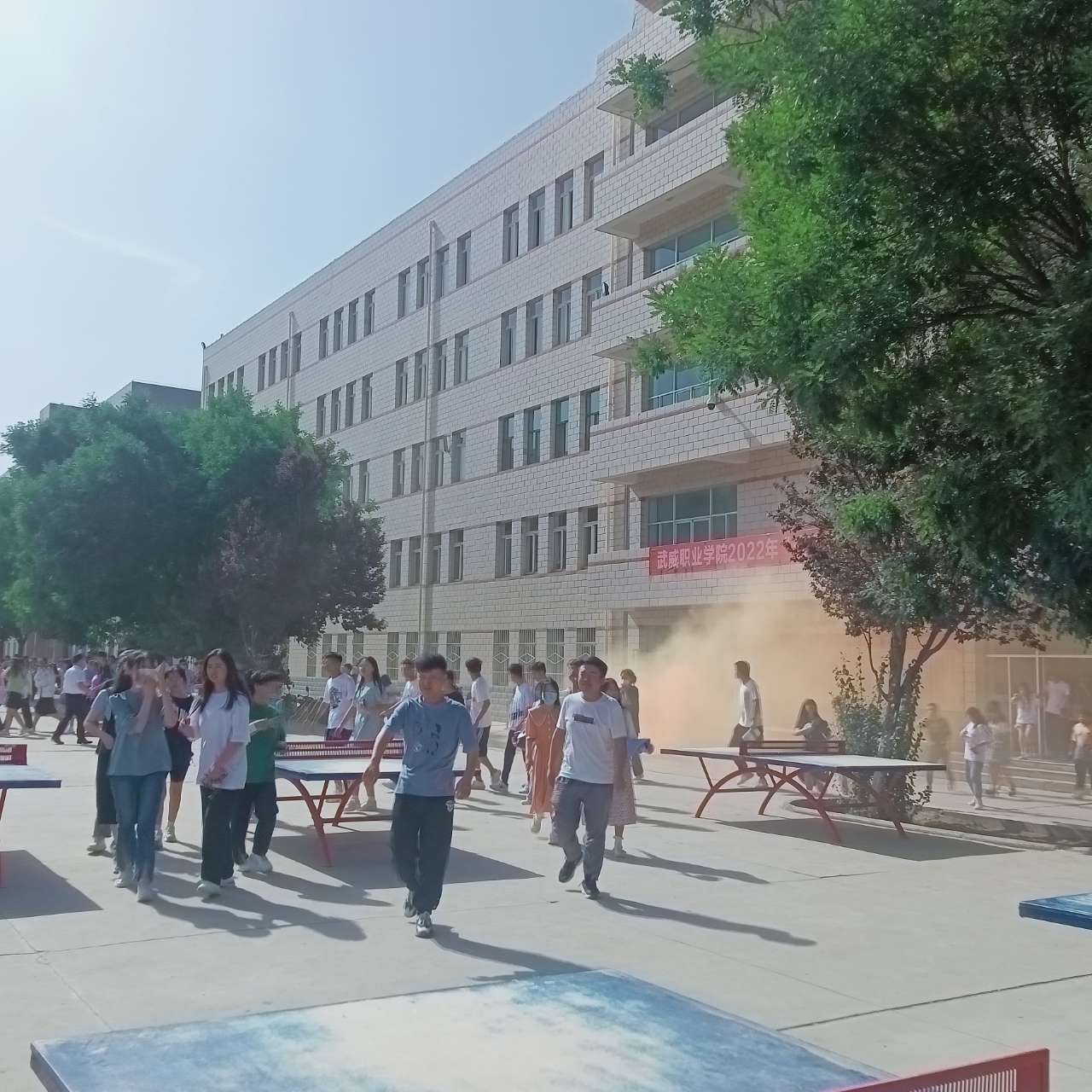 ? ?下午16:50隨著警報(bào)的響起,煙霧彈的點(diǎn)燃,上課老師組織學(xué)生疏散,各班學(xué)生在老師們的指揮下,按照指定路線,貓著腰,用手、袖口捂著嘴鼻迅速有序地進(jìn)行緊急疏散,全體師生撤離到安全地帶。為保證所有同學(xué)安全撤離,學(xué)生會成員迅速清點(diǎn)了各班級人數(shù),并像楊老師匯報(bào)。