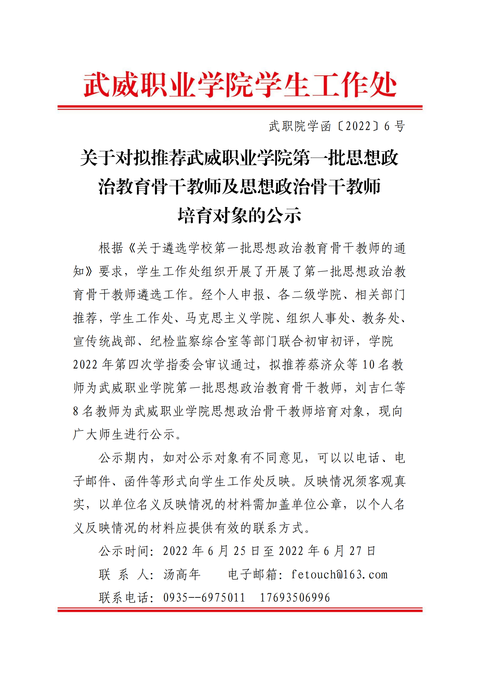 關(guān)于對擬推薦武威職業(yè)學院第一批思想政治教育骨干教師及思想政治骨干教師培育對象的公示