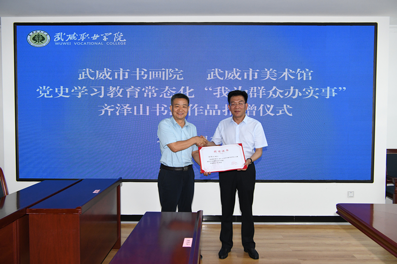 黨委書記、校長趙明向市書畫院(美術(shù)館)院長齊澤山頒發(fā)了捐贈(zèng)證書,武威市書畫院(武威美術(shù)館)院長齊澤山將精心創(chuàng)作了8幅大幅書法作品捐贈(zèng)給學(xué)校。