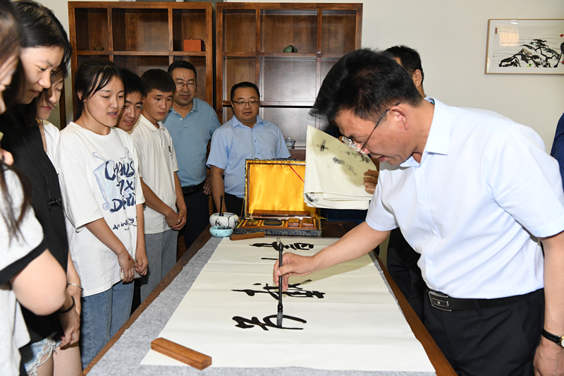 捐贈(zèng)儀式前,齊澤山一行參觀了學(xué)校紅色文化藝術(shù)館、學(xué)生發(fā)展中心、雙創(chuàng)中心、藝術(shù)與教育學(xué)院書法實(shí)訓(xùn)室等場地,并現(xiàn)場指導(dǎo)學(xué)校志通書法協(xié)會(huì)學(xué)生習(xí)作。